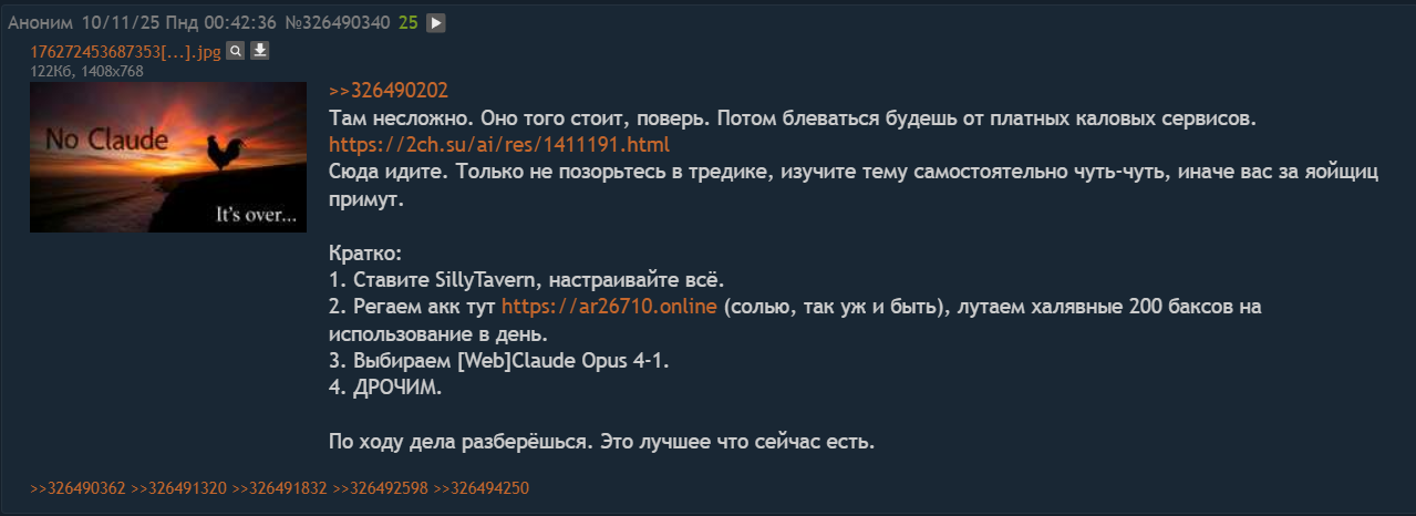 Ну как вы тут, все на проксях сидите? Какая у вас тут сейчас мета? Я вот сижу на локальном Кими К2 на 256к контекста с кобольдофронтом, а вы все сосете силлипидору как я погляжу.. Как ТОЛЬКО перестал следить сначала за этим (конец 23 начало 24 года), потом за тредами на форче так все сразу наладилось. Ключи на провайдер бешеных локалок без цензуры пиздятся, когда нет - ну пейпигнуть можно, что такого уж? >ряяя пейпиг Не так уж и дорого Хочется вспомнить 2023 год когда была тряска из-за проксей но сейчас понимаю что сейчас гораздо лучше, самая худшая локалка имеет больше контекста чем первый клод