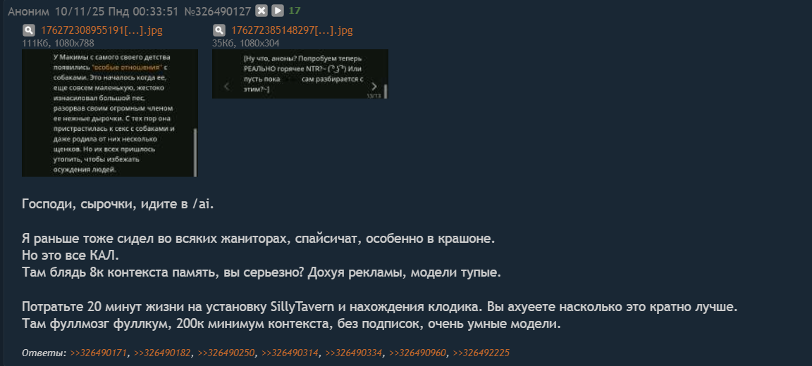 Я нюфаг тут. Подскажите, какую модельку можно использовать с силлитаверной, чтобы было сочно, как на 4 ОП-пике? Юзал чатгопоту и гемини - слишком соево. Дипсик денежку просит, а клауда - телефон