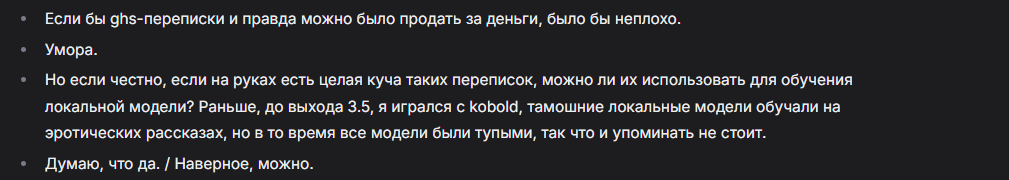 >>1411509 ГЛМ дает надежду что когда-нибудь у нас будут нормальные открытые сетки для РП, которые никто не отнимет, как случилось со старыми Клодами, и как случится с третьим Опусом скоро.
