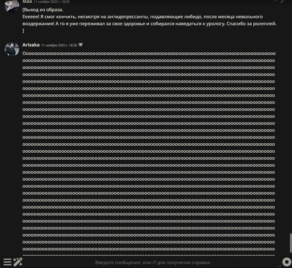>как она забивает на разделения форматирования и начинает пихать в звездочки рассуждения. Если одна и та же антидумалка на всем рп, то сделай другую, заменив символы на другие как в последних сухих безжопах. Топ п и температура так же, их нужно менять в зависимости от контекста. Нюансов много, без переключения рычагов слоуберн очень калово играется.