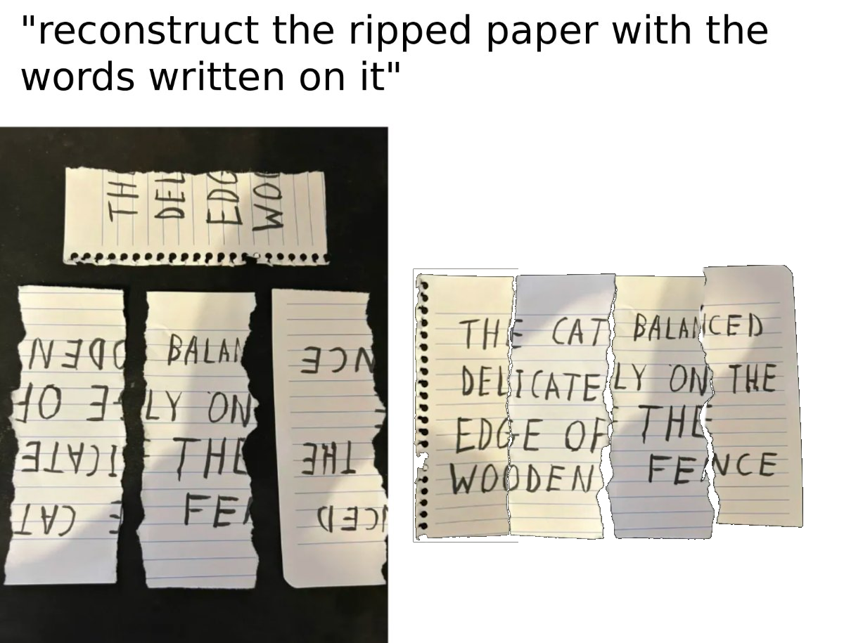 >>1413842 >3 пик Так это не правильно оно сделало. Вот я сделал, как оно должно было быть. Оно, получается, просто прочитало текст с листочка и сгенерировала целый НОВЫЙ листочек с таким текстом, а не реконструировала из обрывков листочек как надо.