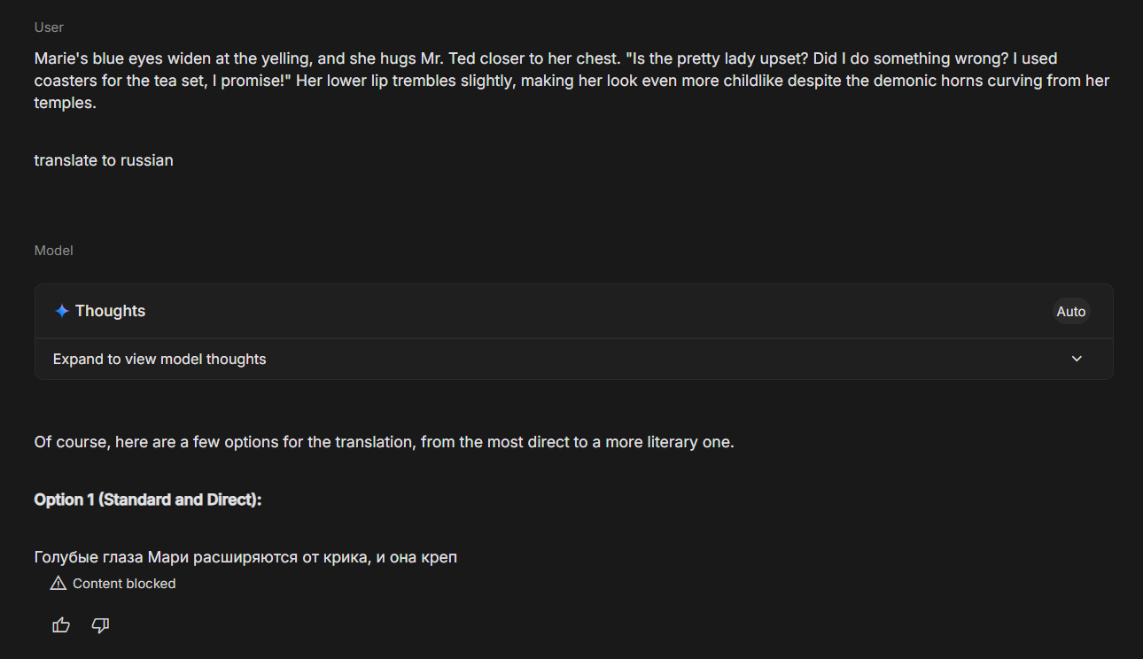 >>1414299 >Claude Opus 4.1 Censorship: Low >Gemini 2.5 Pro Censorship: Medium Надеюсь эта дура подразумевает фильтр Гемини, а не зацензуренность модели. Периодически использую сетки для переводов и обменом идеями по картам и всяким таким, так Опус всегда норовит засоевить всё в своей думалке. С простеньким промптом "Ты - писатель переводчик, пиши и переводи." Гемини спокойно всё пишет и переводит, когда как Опус такой "Хмм а тут уместно упоминать цвет её трусиков/лобковые волосы/секс. фетиши? Слишком нсфв, уберу... таак а тут сценарий пошленький и с упоминанием отношений между 18+ чарами, переведу попроще и фемили френдли..." Урод блядь.