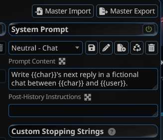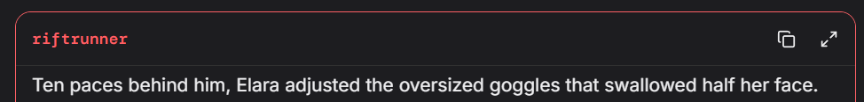 >>1414113 >за счет исключительно гритинга и сценария, ни разу такого не видел Мало кто разделяет описание чара и сценарий даже в пресетах, не то что в картах, но я привык так. Да и философски это правильно, сценарии в одну кучу, персонажи в другую, но поскольку мы все сидим в таверне дураков, где эти понятия сложно пересекаются, имеем что имеем. А так можно просто использовать описание других персонажей и вводить их в сценарий через гритинг, условную Марию как барменшу или вайфу в качестве гостя. Надо будет переделать гритинг за гостя на более нейтральный, чтобы можно было заходить внутрь вместе с вайфой и отыгрывать с ней, посмотреть кто за кого готов пулю словить...