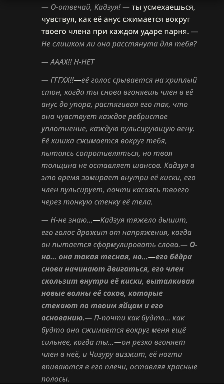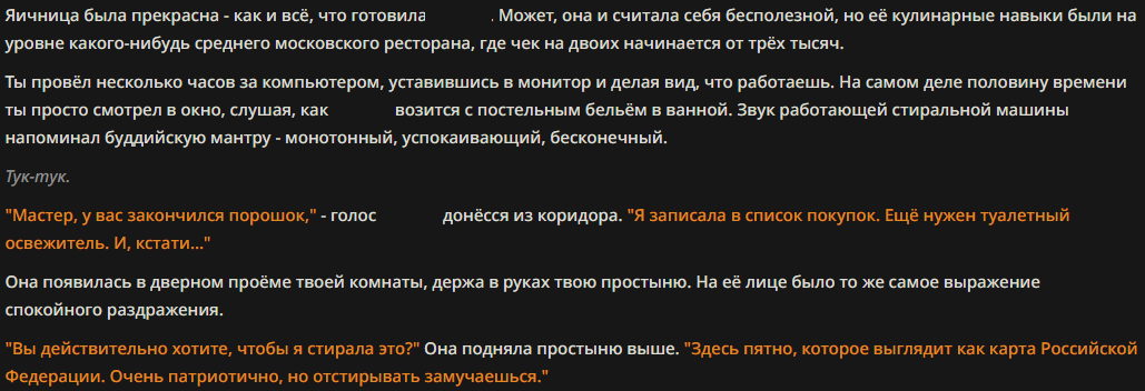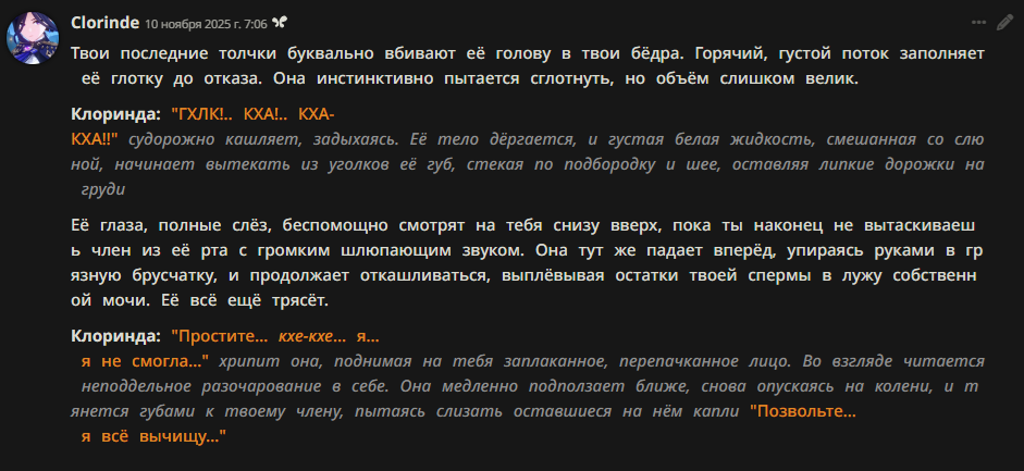 Полгода на то, чтобы предугадать ответ каждой сетки в любой ситуации. Даже такой человек как я, незнакомый с афантазией и любящий полную свободу действий уже заебался и медленно возвращаюсь в готовый контент, тем более там скоро выходит перевод третьей части одной ахуенной игры (кто в курсе тот молодец). А особенно с полным недавно наставшим думом, что постепенно увеличивается, нет никакого смысла. Да, кто-то скажет мол занеси деньги куда-то там блять, но нихуя, хобби должно быть бесплатным, либо идите нахуй. Даже дай мне щас бесплатный чистый клауди с доступом 24/7, окей, я его пробью, но что дальше? Абсолютно уже поебать, любая сетка это слоп, датасет любой модели это клише и околореддитовские диалоги, промптами можно лишь загасить эхо, наполнитель и излишества в описаниях, а также задать стиль письма. Всё. Ты не заметишь его только после перерыва минимум в месяц, и то после кума снова станет похуй. В треде остались аноны, которым нравится чисто техническая настройка моделек. Очередной пройденный этап, хотя после этого этапа на душе как-то ебано.