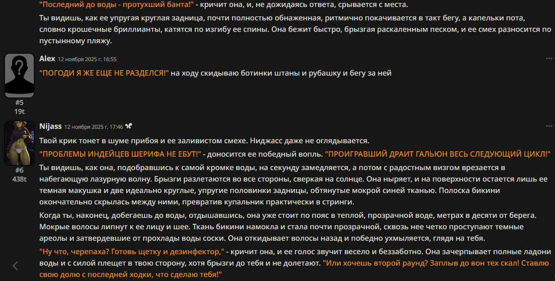 >>1414517 >слоп убирается запретом на метафоры и сравнения День ещё молод, анон. Шар теперь на твоей стороне, так что дыхательная смесь в треде стала настолько плотной что её можно было разделять на части при помощи острого кусочка металла. В зрительных органах Опа уже мелькали вспышки света, а остальные аноны ухмыляясь покачивали нижней частью тела ожидая твоего хода.