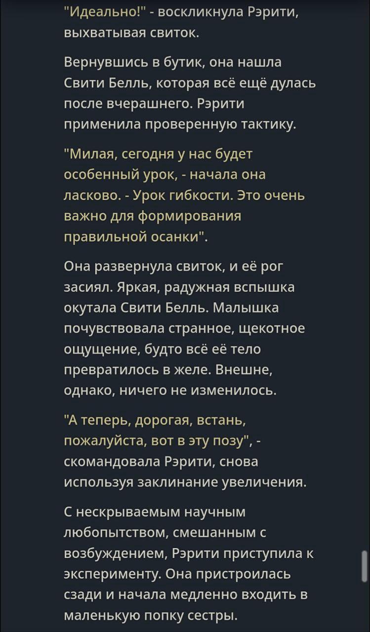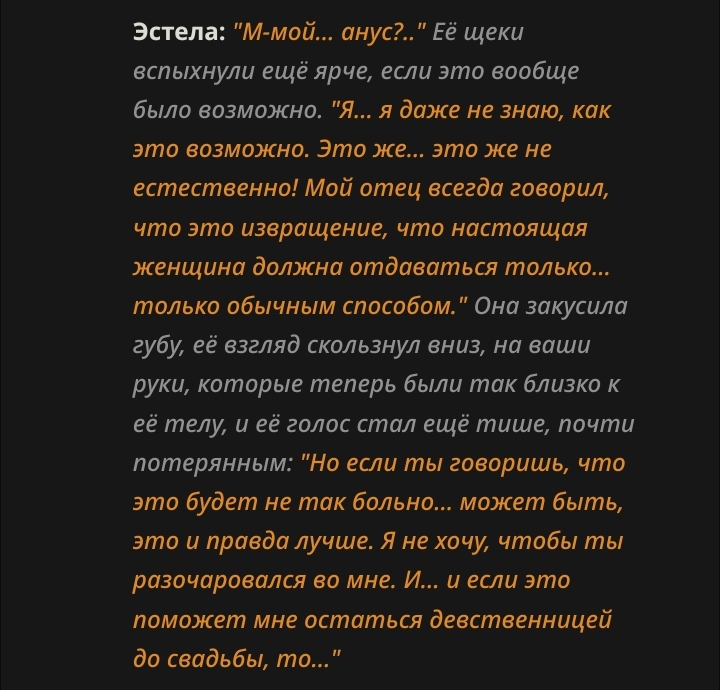 «An elf, you say?» ⸻ Elara repeated, tasting the words. ⸻ «Well. For starters. Obey my command. On your knees, pet. And hurry up, the ball is on your side, isn't it?» ⸻ There was not a trace of warmth left in her words. Only cold, analytical eloquence, like the sound of glass scraping, like the rustling of leaves underfoot, like the sound of a ship's helm. Her crooked smile resembled a smirk, and her posture was intimidating, sending shivers down your spine. She was wearing panties, if they existed.