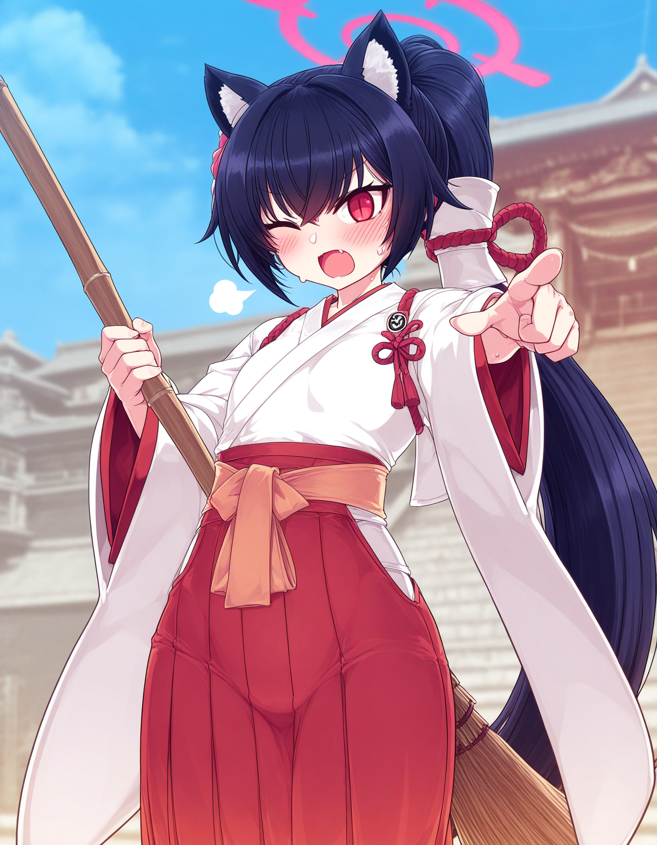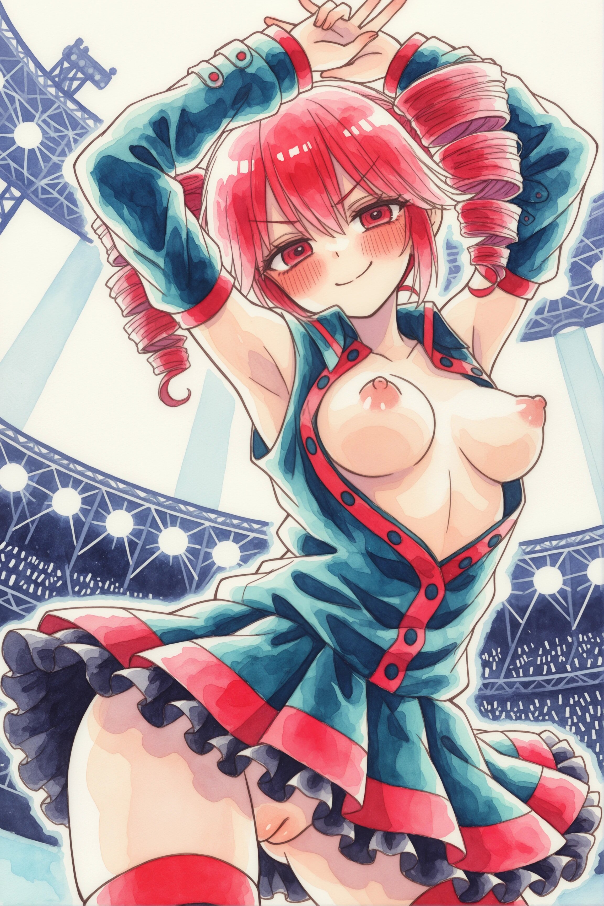 Posivite Promt: masterpiece, best quality, very aesthetic, absurdres, newest, highres, 4k, rich colors, face focus, lineart, 1girl, kasane teto, drill hair, gray double-breasted, gray skirt, twin drills, red eyes, red hair, hand on own chest, buttons, looking at viewer, standing, belt, ahoge, socks, frills, nail polish, ribbon, cross-laced footwear, hair ribbon, red nails, frilled skirt, pleated skirt, command, obey, open mouth, cowboy shot, attack, angry, pointing, pokemon, vulpix, solo, attack, abstract background, breathing fire, small creature, tail, (cute: 1.5)