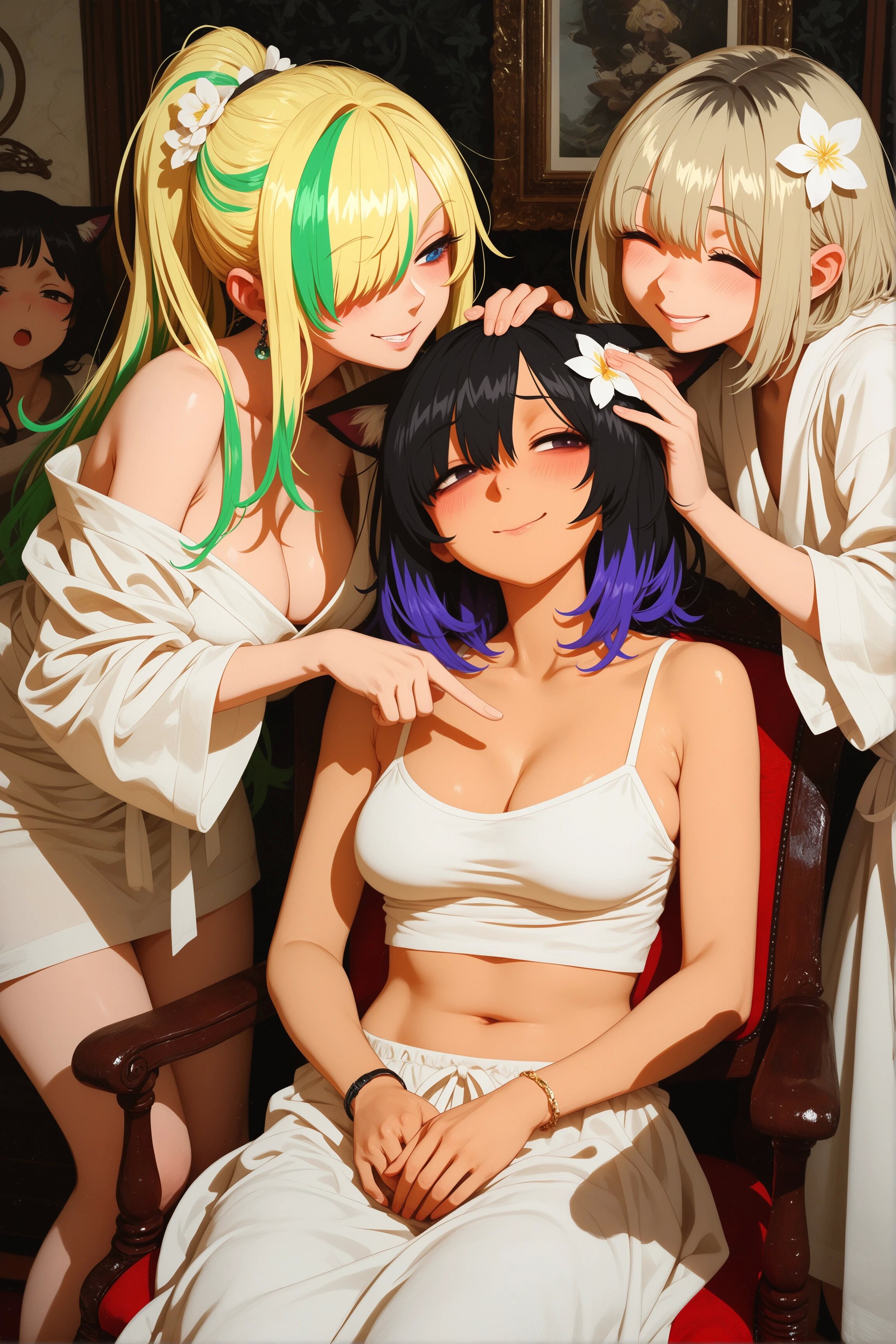 >>1426057 >в комфи Ну я не в комфи делал, а в автоматике. Как будто уже можно было и так оставить, но хотелось почувствовать ту пресловутую магию Kohya Hires.fix. Картинку на белом фоне получал с помощью регионал промтера, потом склейка наиболее удачных генов в фотошопе, и img2img