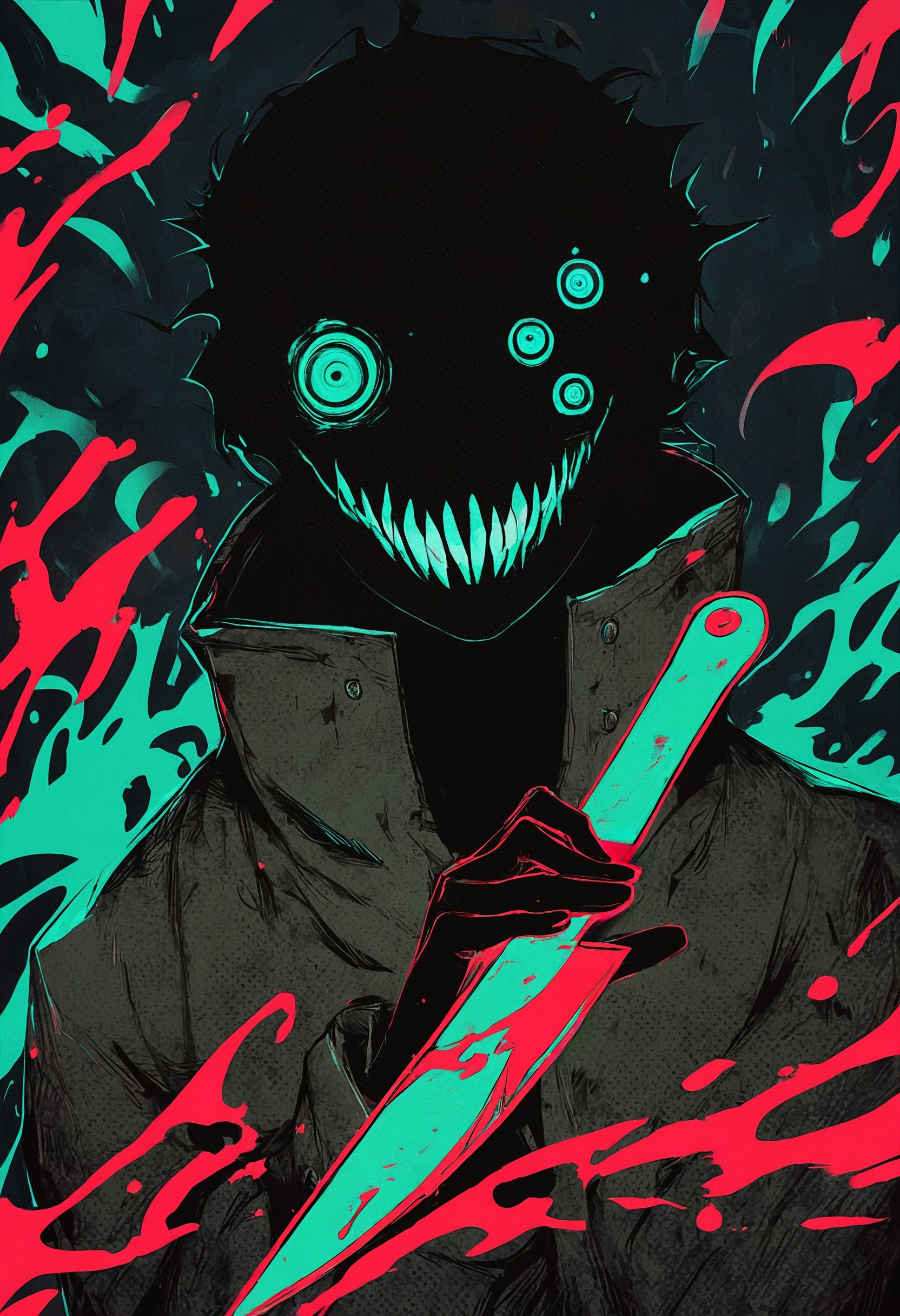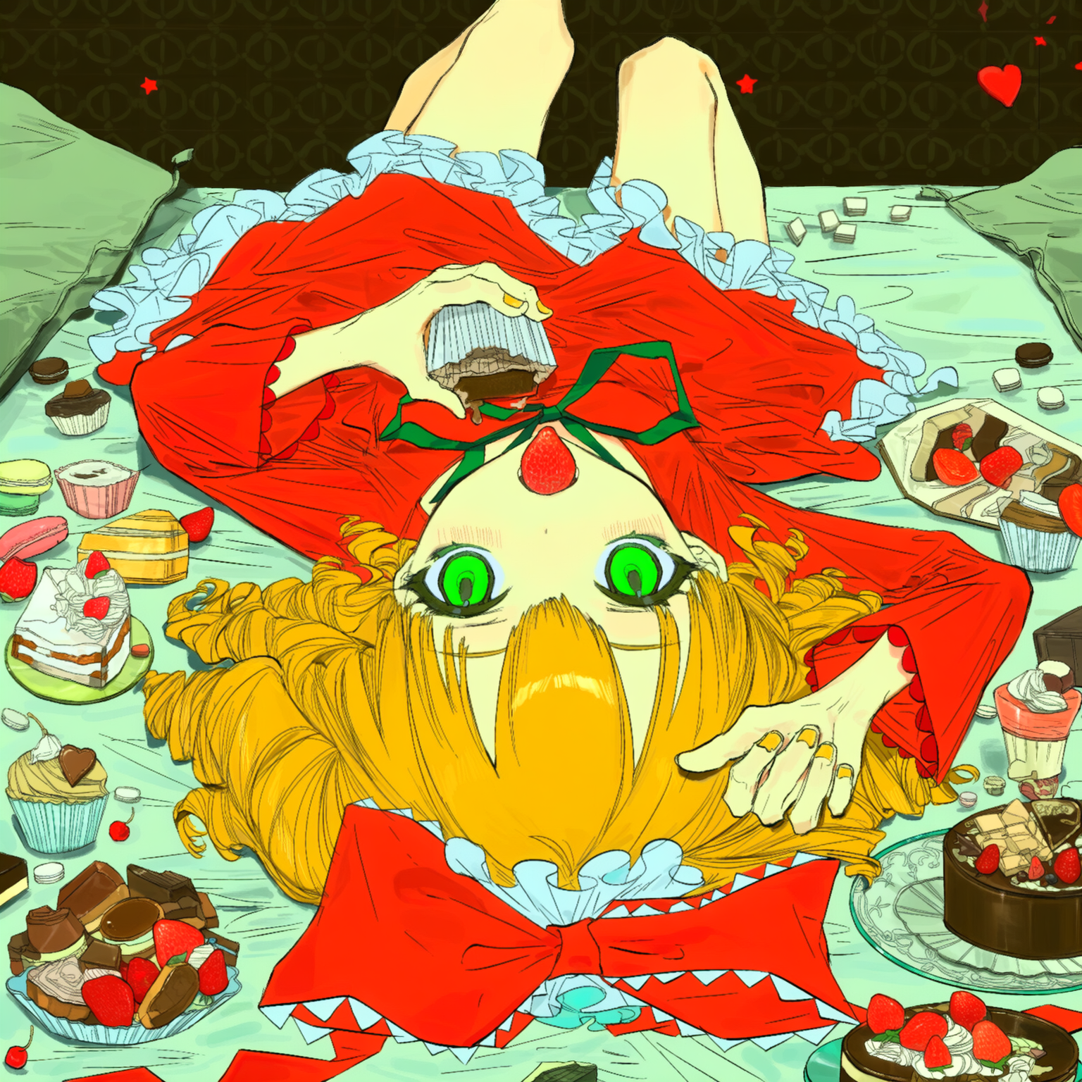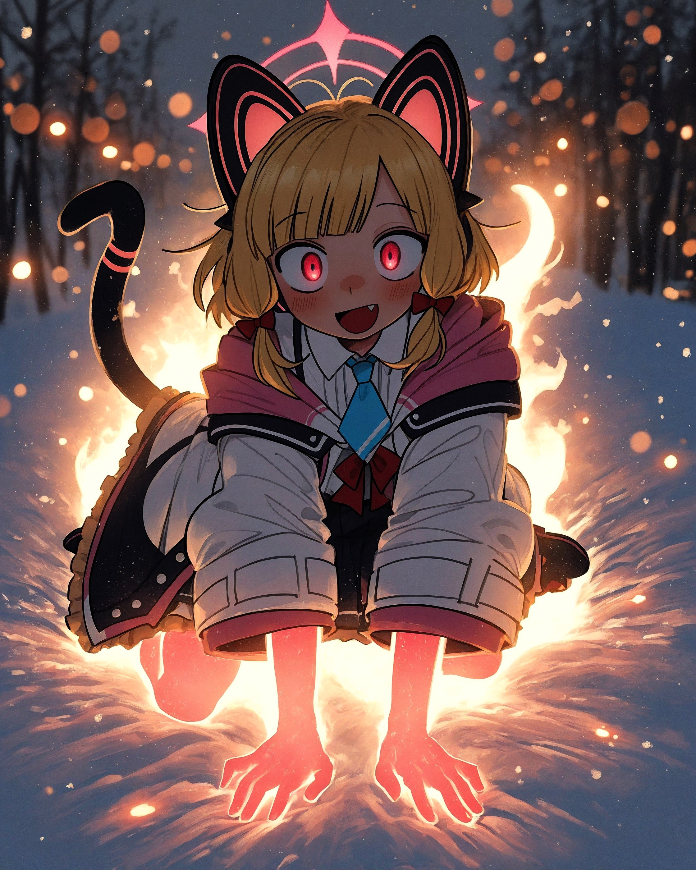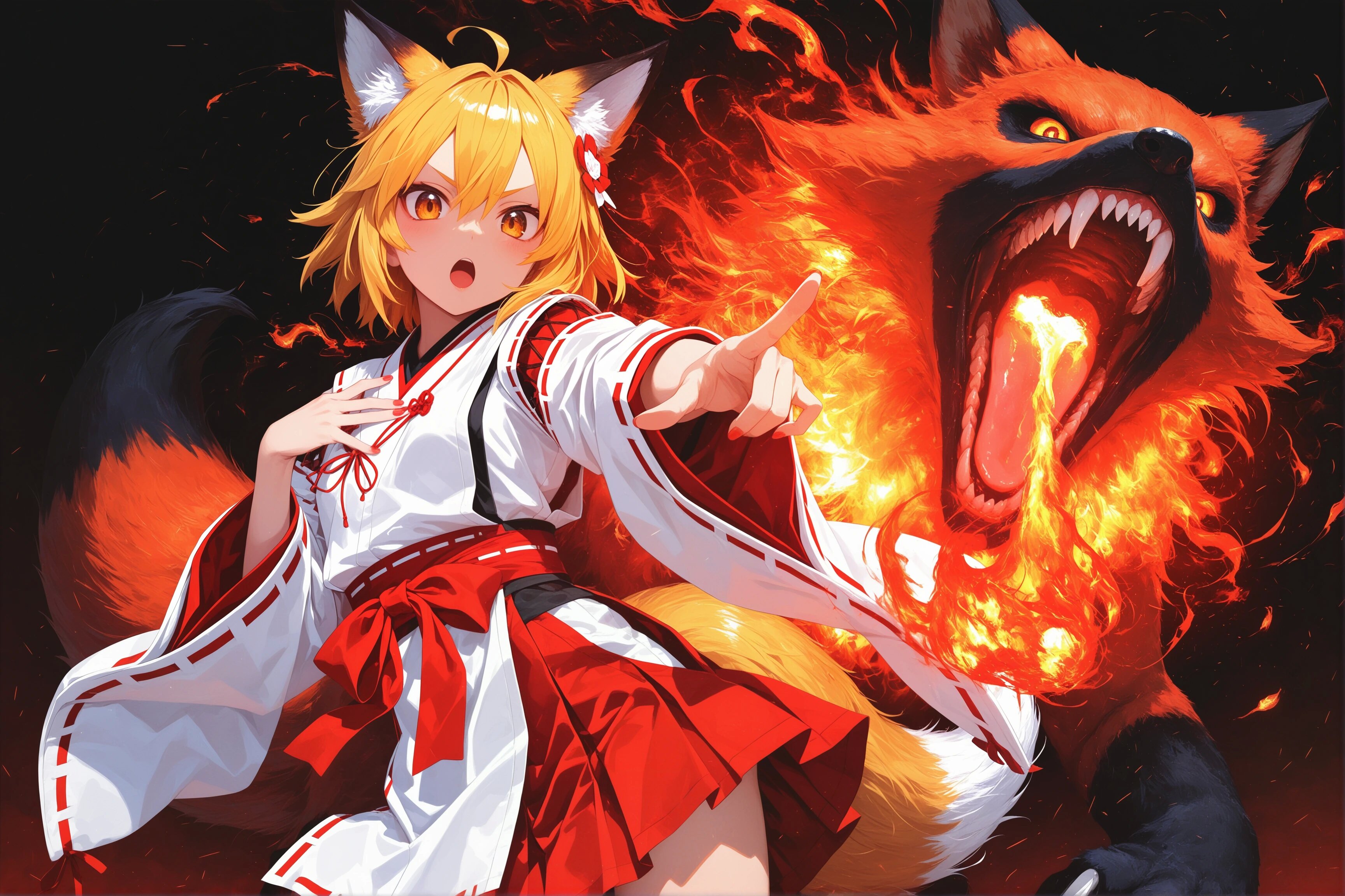 Из джойкопшен в квине. This is an anime-style digital illustration featuring a young girl with red twin pigtails adorned with white bows, fair skin, and large expressive red eyes. She is dressed in a dark teal school uniform with red accents and a white frilled skirt. Her expression is determined and intense, with her mouth slightly open, showing white teeth. She has her right hand pointing forward with a firm grip, while her left hand is positioned near her chest. Beside her, a dynamic, fox-like Pokémon with orange-red fur, large fluffy tails, and pointed ears is mid-leap, breathing a bright red-orange flame from its mouth. The Pokémon's fiery breath illuminates the surrounding area, adding intensity and movement to the scene. The background is a gradient of dark red to black, which enhances the contrast and focus on the characters. The girl's uniform has red buttons and trim, and her skirt has a white frill at the bottom. The Pokémon's fur is detailed with visible shading and texture, and its eyes are wide open with a fierce expression. Overall, the illustration uses bold lines and vibrant colors typical of anime art, with a strong emphasis on action and energy. The composition is dynamic, drawing the viewer's attention to the interaction between the girl and the Pokémon. The artist's style emphasizes dramatic expressions and dynamic poses, characteristic of anime illustrations.