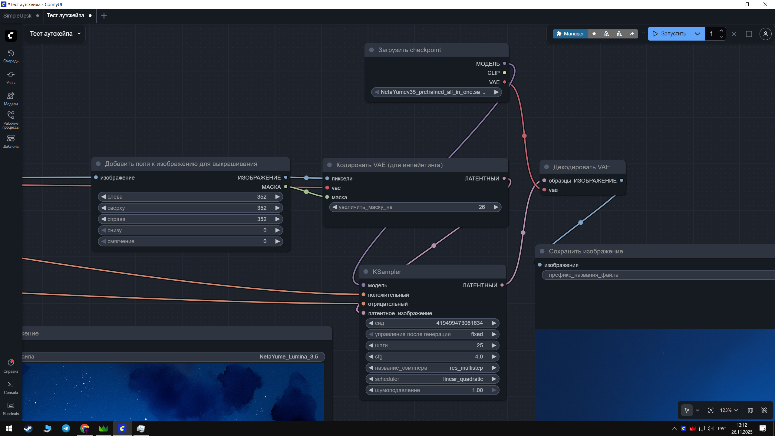 Здравствуйте. Вкатываюсь в Комфи. Как генерировать 1024х1024 уже +- понял, как апскейлить до х4 тоже. Но при попытке заставить нейронке расширить границы изображения выходит вот такая мазня в области увеличения. Что я делаю не так? Или широкоформатные изображения получаются иным методом?