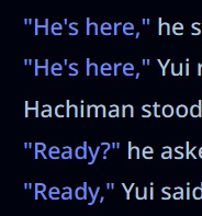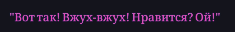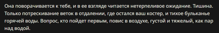 Ну что во тут >>1420865 за говно? Такой формат называется ЧАТИК и подходит только к редким карточкам типа тиндера, где ты имитируешь переписку в мессенджере аля чайная. Кусочек описания интонации и "фраза". Пиздец. Дно.