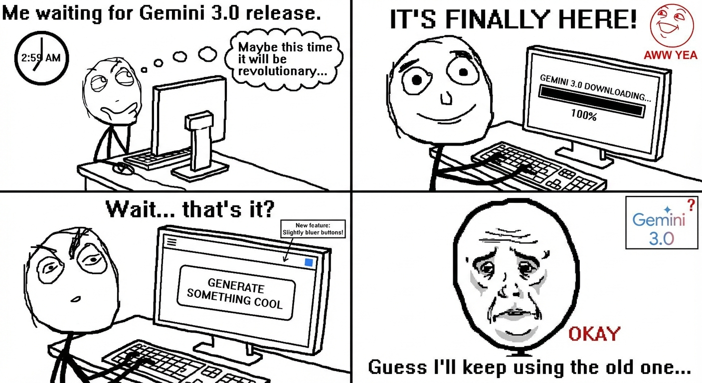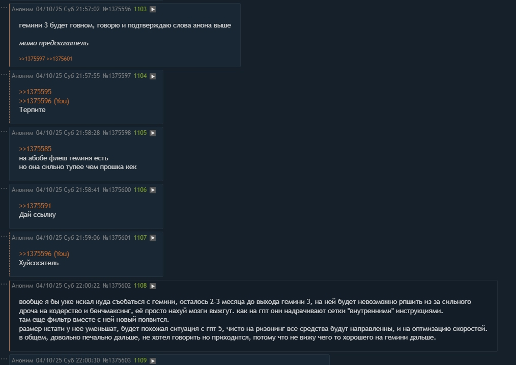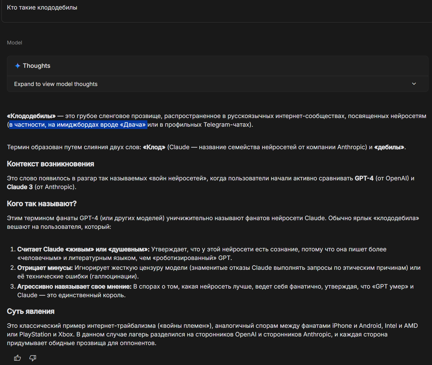 У клодо-петухов и гемини-клопов одинаково проявляется форма отрицания, когда выкатывают очередную "новую" версию их ИИ, и он закономерна оказывается говном, то они тут же включают самовнушение "предыдущая версия лучше была!", причем говорят так всё равно, ведь предыдущая версия тоже была говном по сравнению с пред-предыдущей.