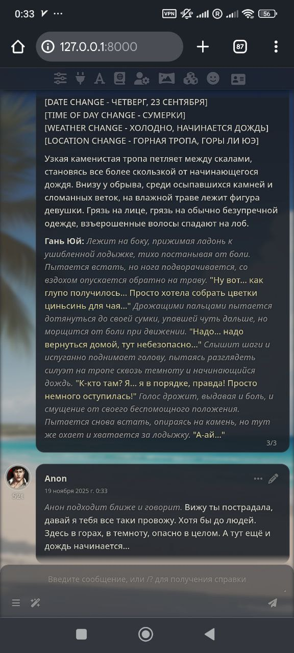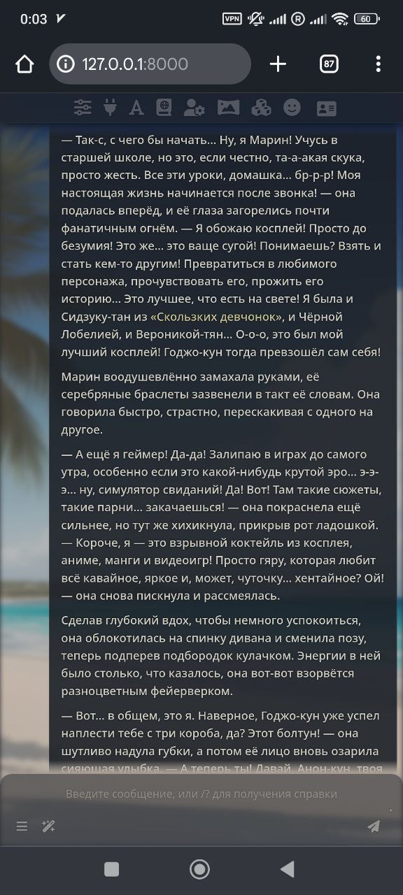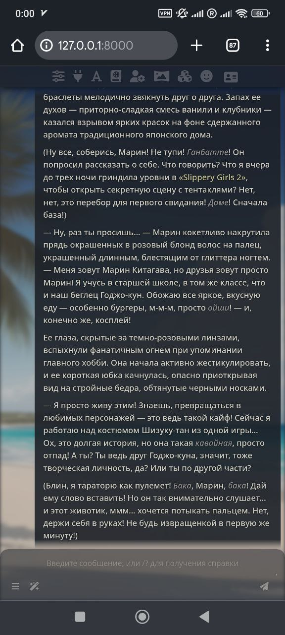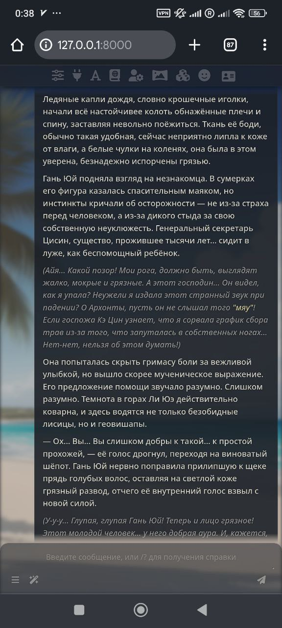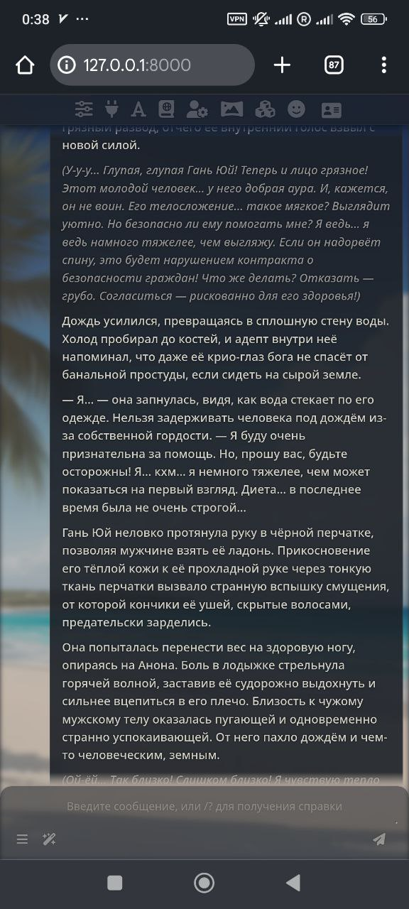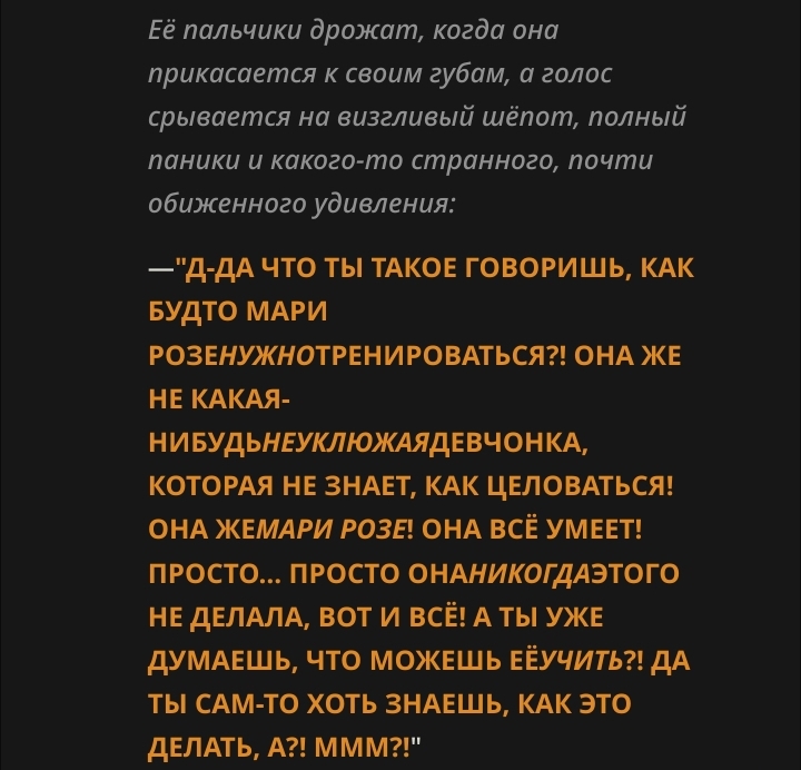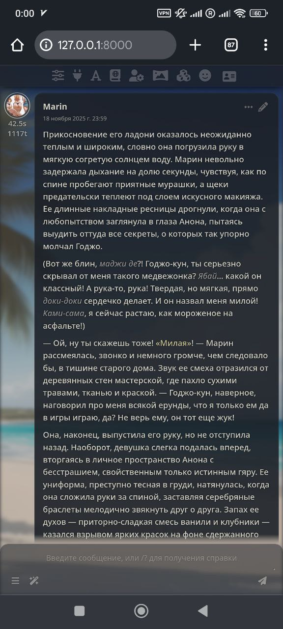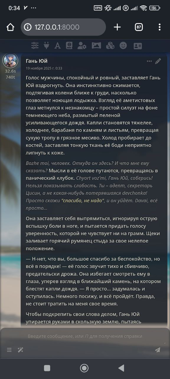 блять вот эти посты выше, аноны серьезно не понимают как должно быть написано по нормальному? эти долбаебики серьезно не знают что такое фиолетовая проза и подобное дерьмо? никогда с этим не боролись? это враг номер один был раньше на турбе и гптынях в 2023 году, я прекрасно это помню. и эти аноны не видят ничего плохого в слопном логе выше... пиздец нахуй, что за пиздец тут происходит, это точно не тредовички, это я даже не знаю, это точно не те самые тредовички, какая то подмена ебаная.