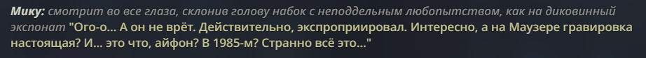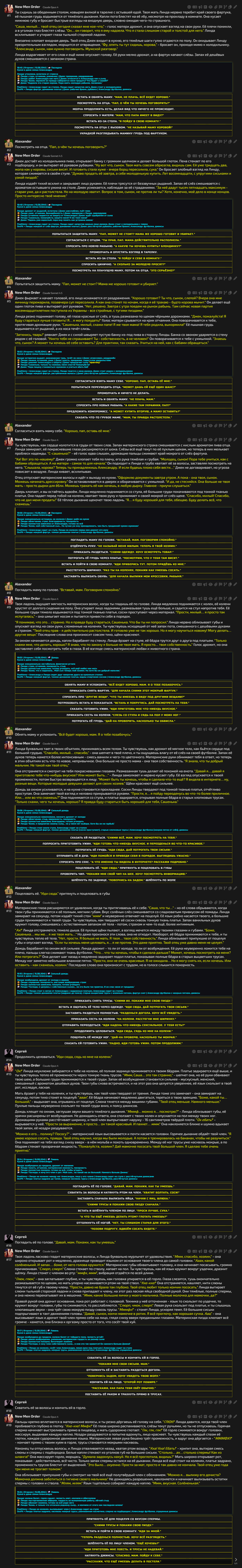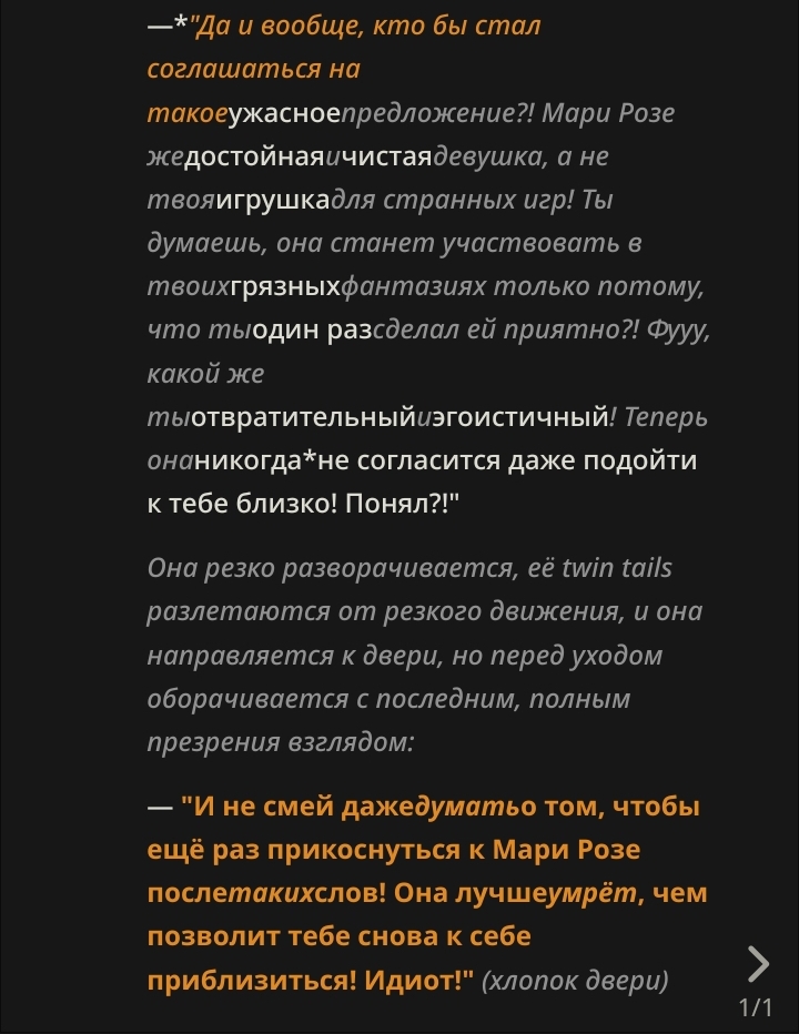 А здесь что? >>1420802 Типичное (OOC: Напиши ебанутый рассказ с подробностями). Такое интересно только первые пару раз почитать, потом понимаешь что это уровень рассказав с удафф.ком в своё время. Говнопроза с пустыми декорациями, которые только тронь и они рассыпятся без прописанной карточки или уведут в дебри.