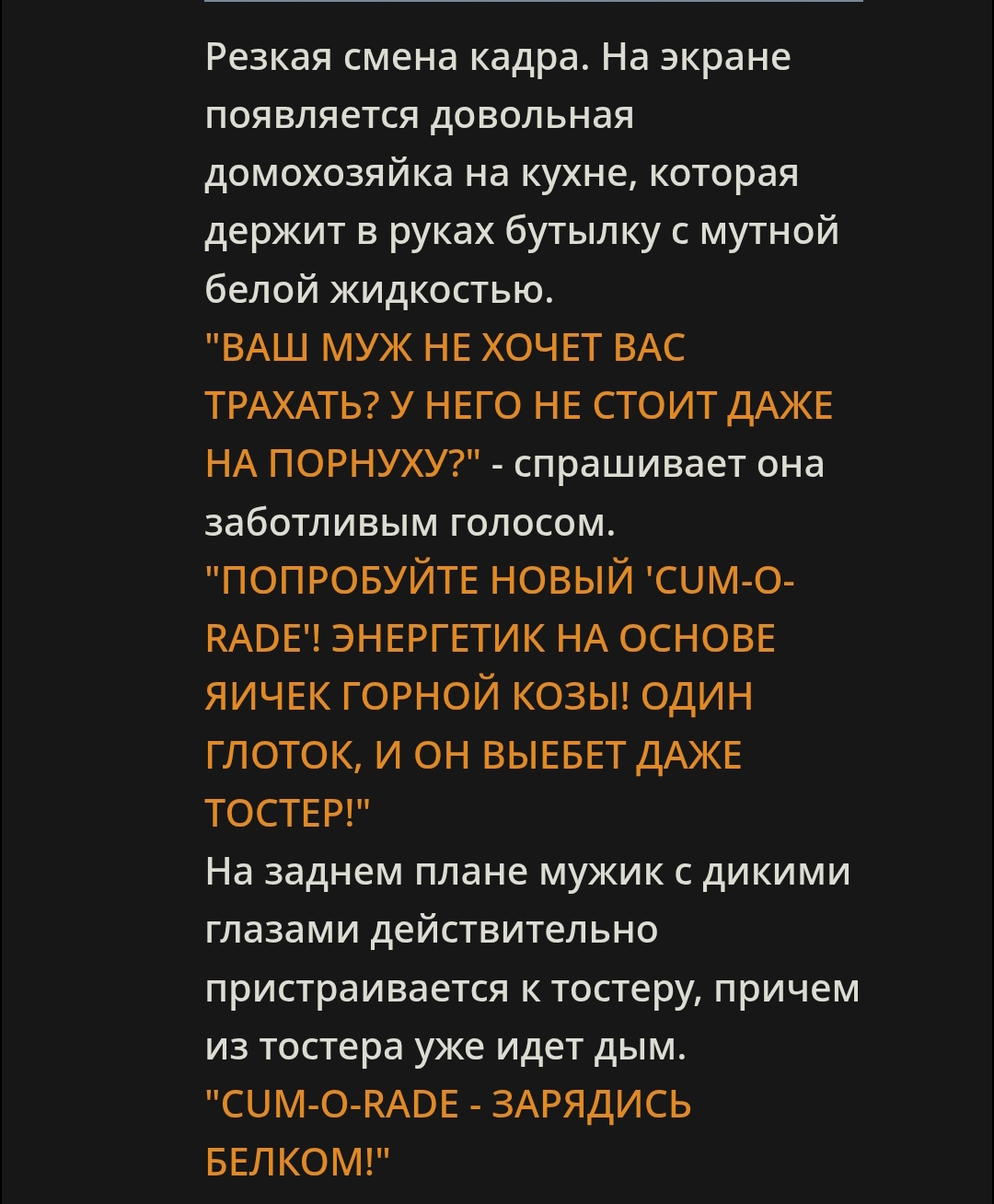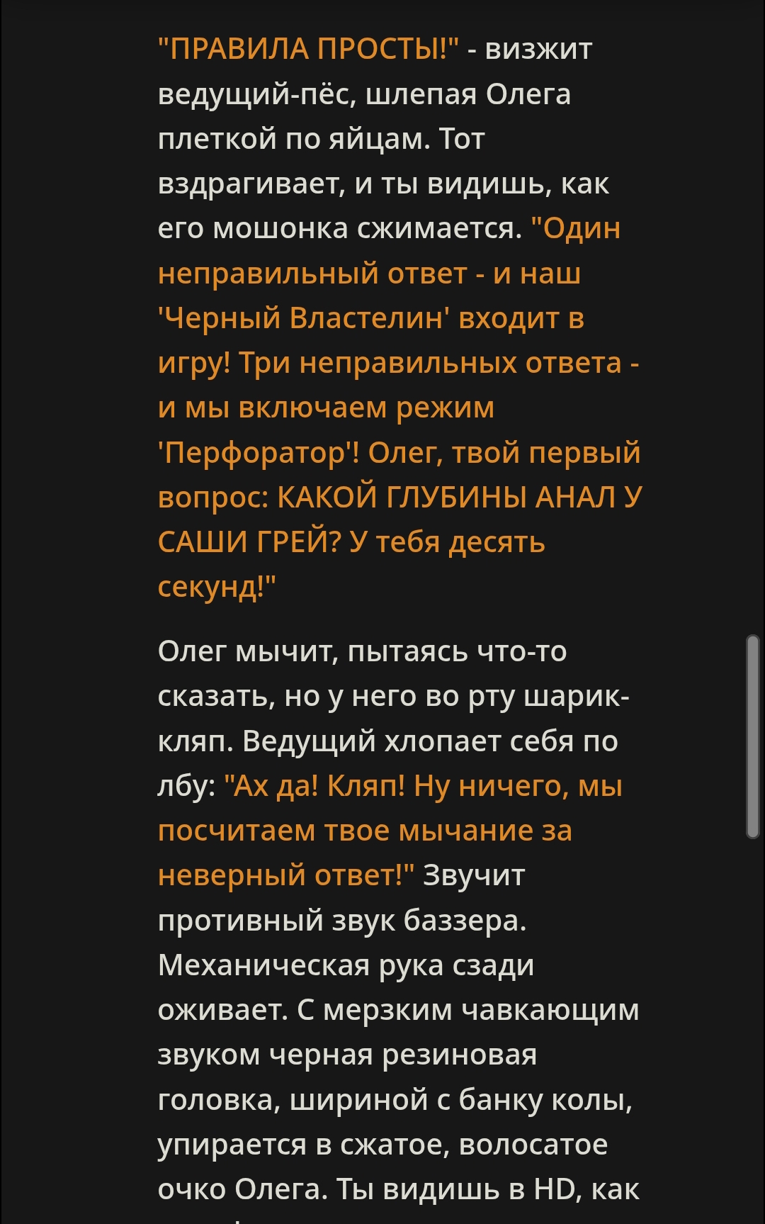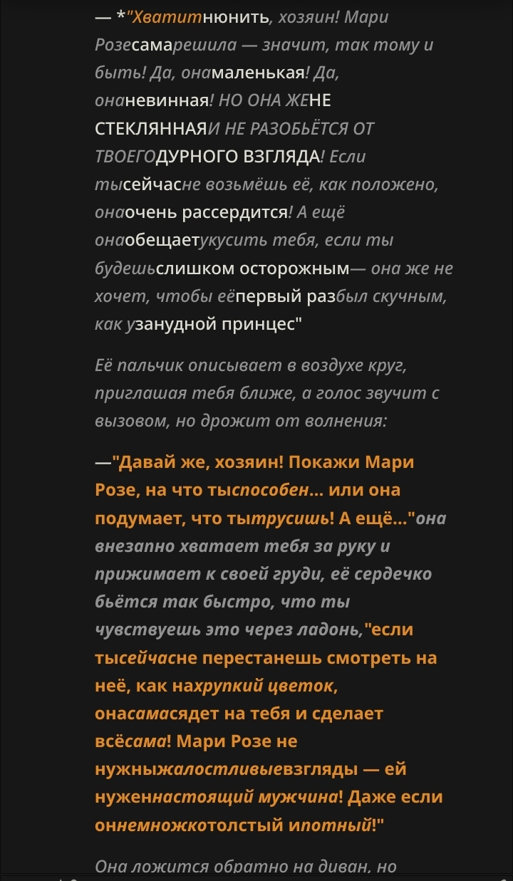 >>1420564 Так, ну пишет по русски вроде норм, сюжетные ходы сильно знакомые, в обороты и книжную речь не вчитывался но то что фильтр стал жёсче меня нихуя не радует... Наверное хтмл разметку может охуенную делать для чаров я хз, по прозе особо до чего то сходу доебаться сложно но и ощущения полного ахуя нету бля