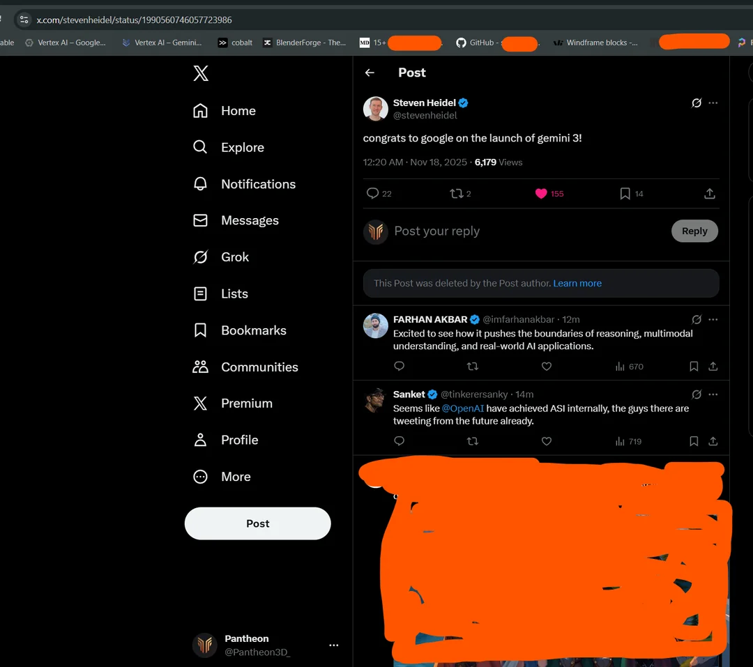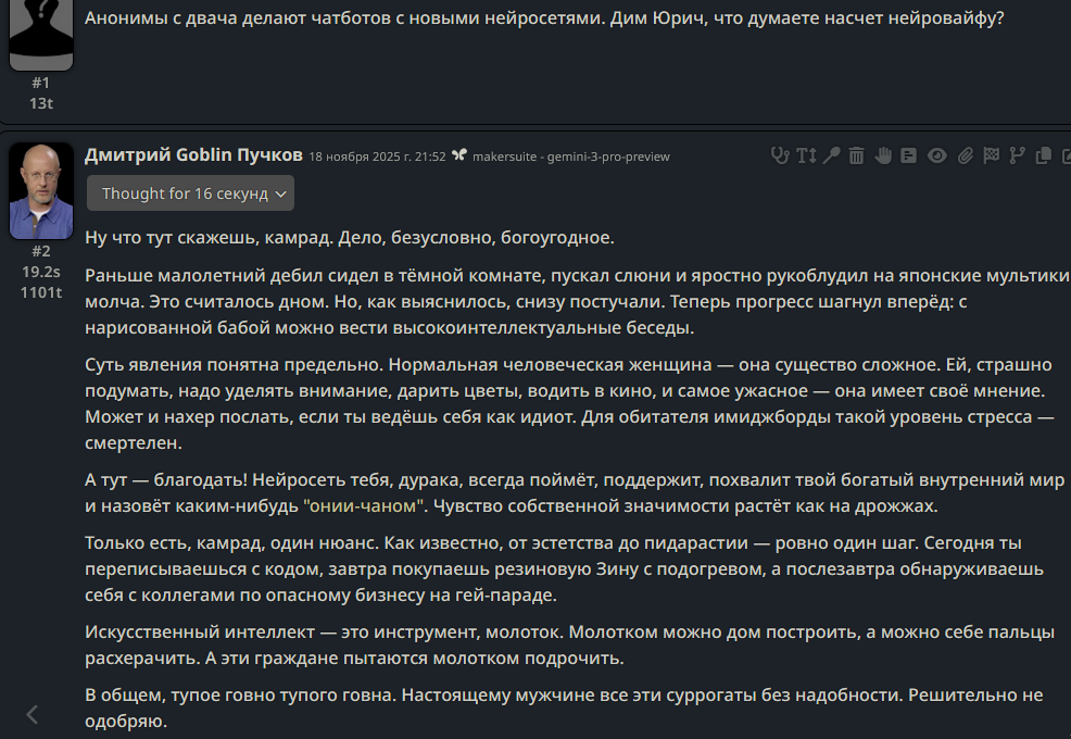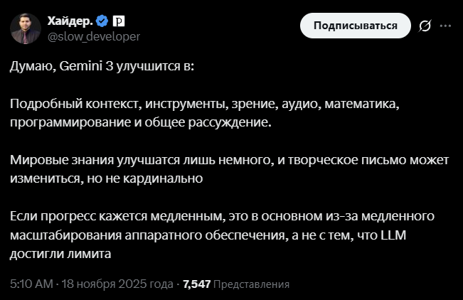В общем потыкал Гемини 3 на прокси. Мне прямо зашло, как он пишет. А после Глма, так вообще, как глоток свежего воздуха. Чисто для сравнения ответ с Гемини 3.