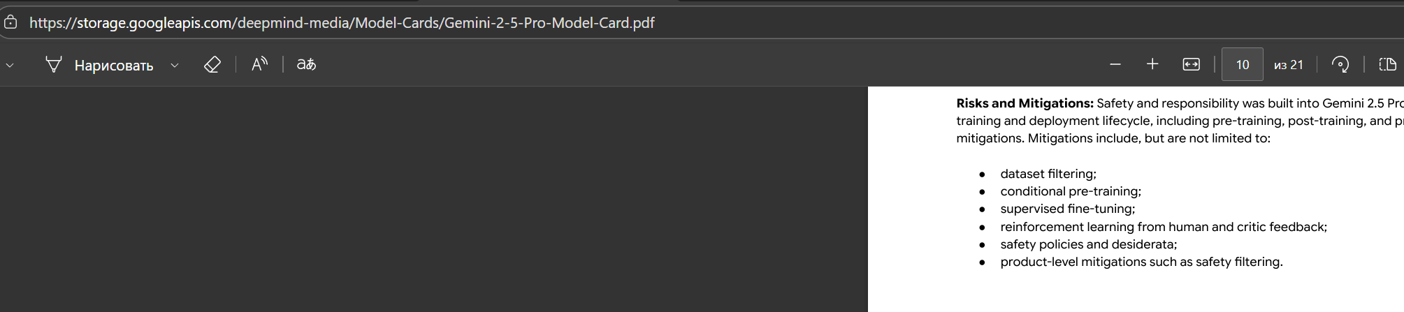 Политика безопасности Политика безопасности Gemini направлена на то, чтобы предотвратить создание нашими моделями генеративного ИИ вредоносного контента, в том числе:
