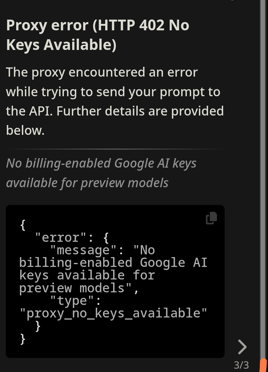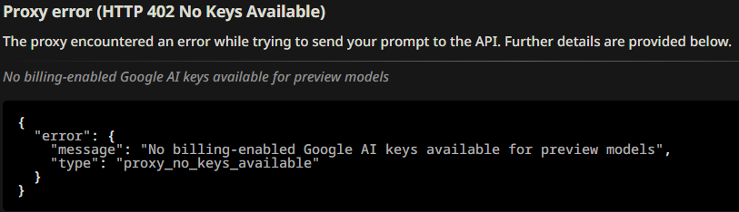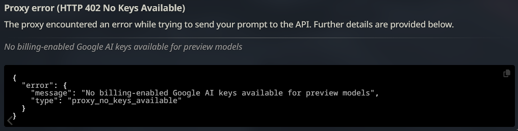 "error": { "message": "Request is not allowed. (Prompts containing images are not permitted. Disable 'Send Inline Images' in your client and try again.)", "type": "proxy_forbidden"