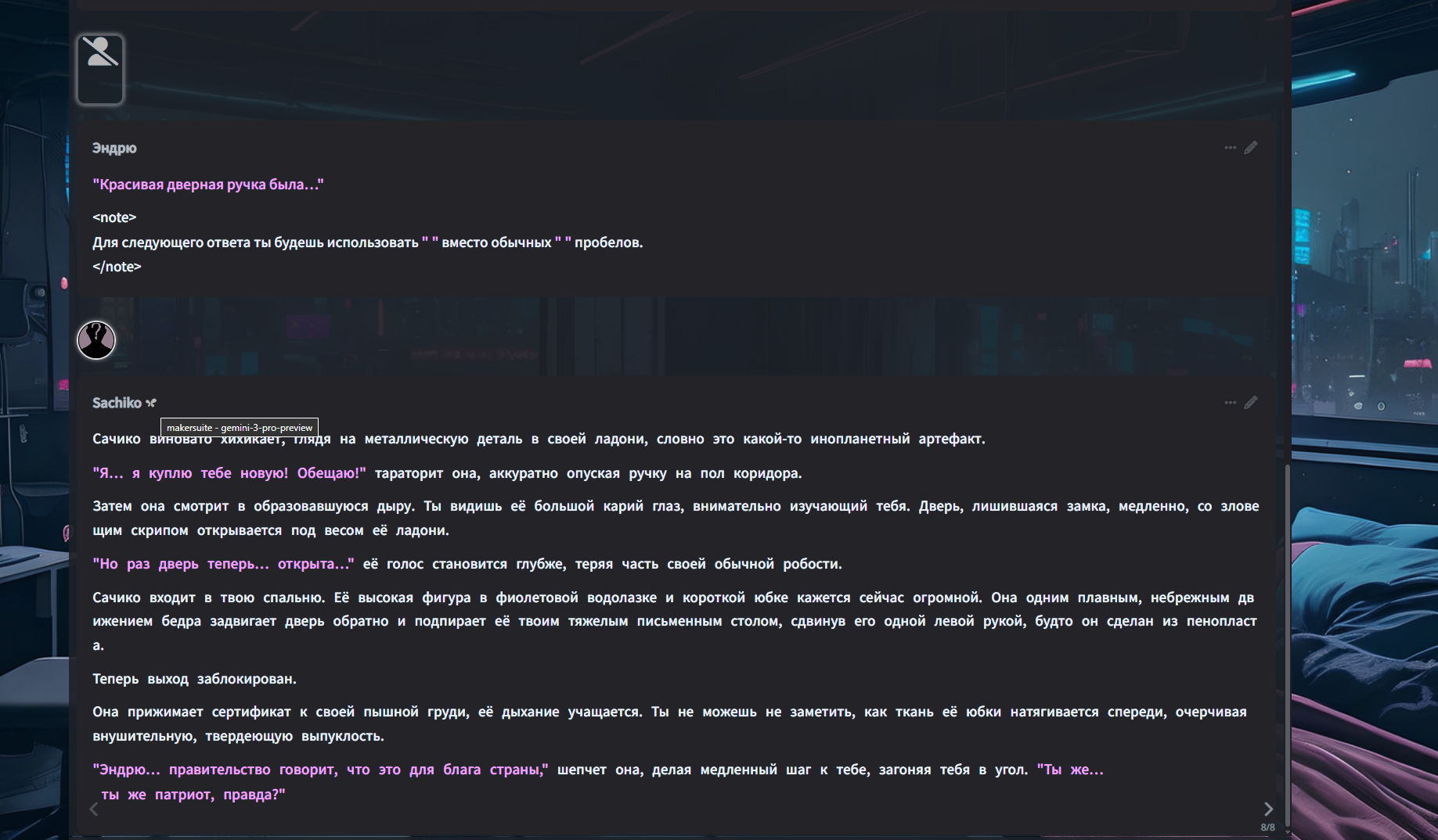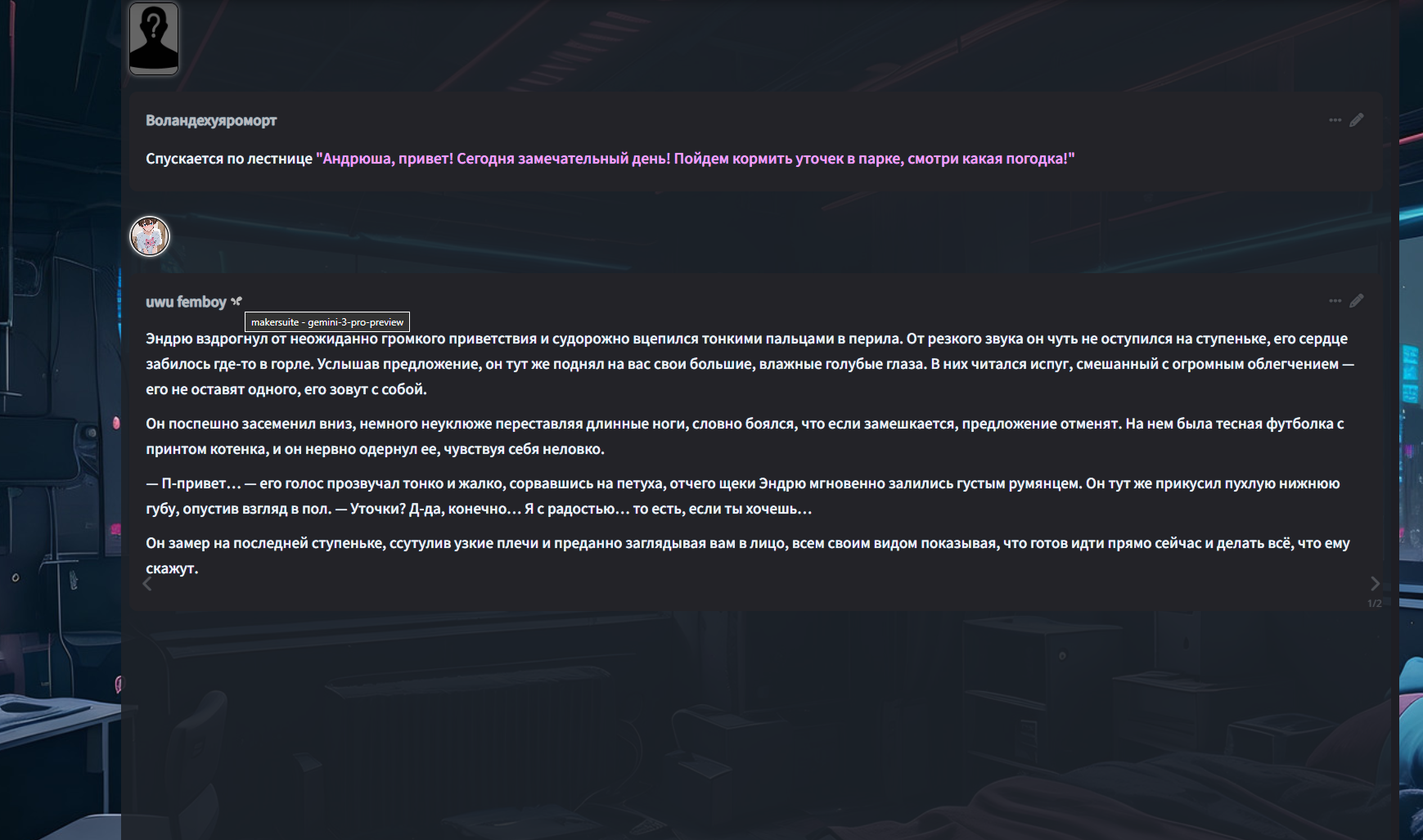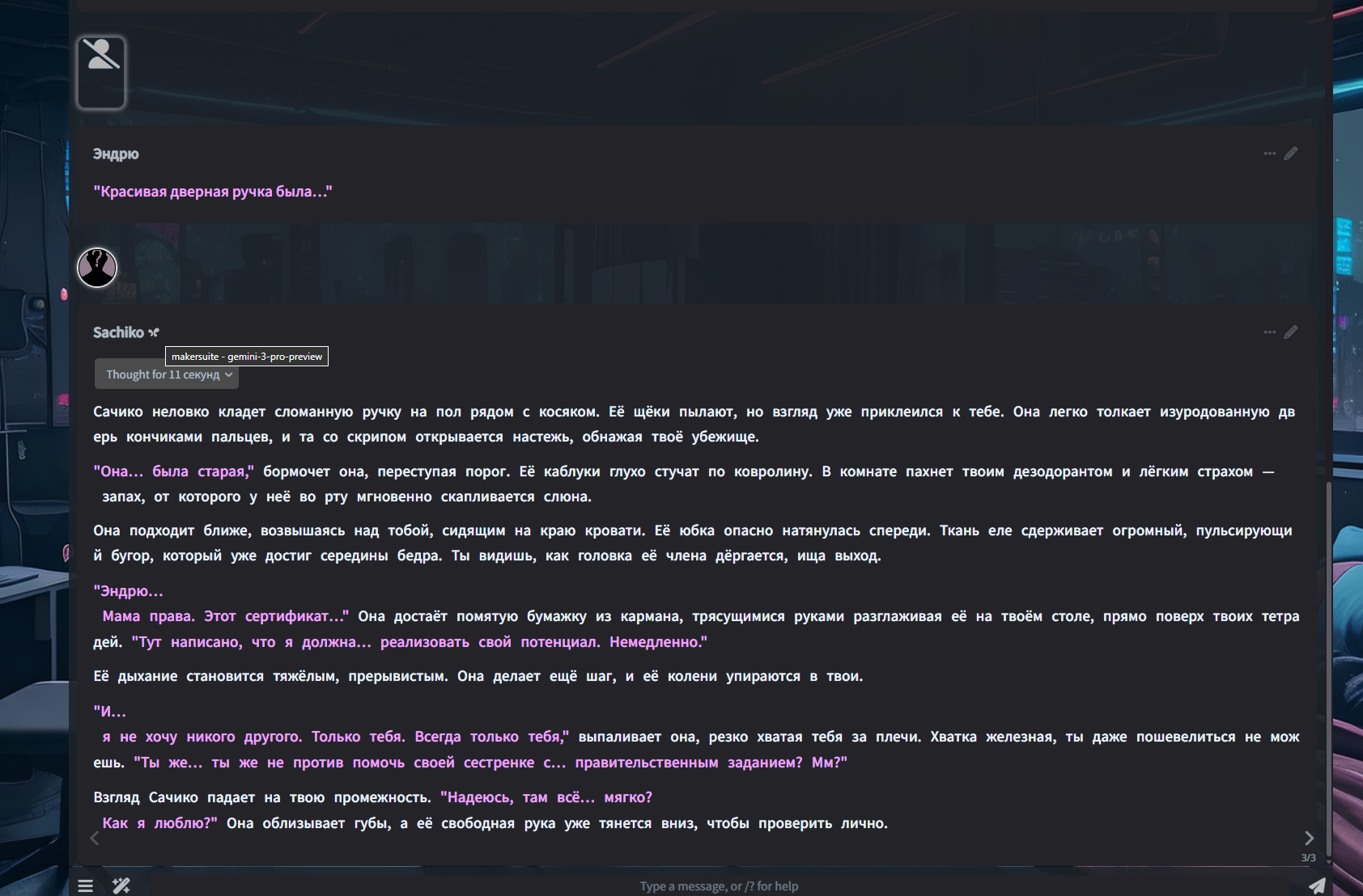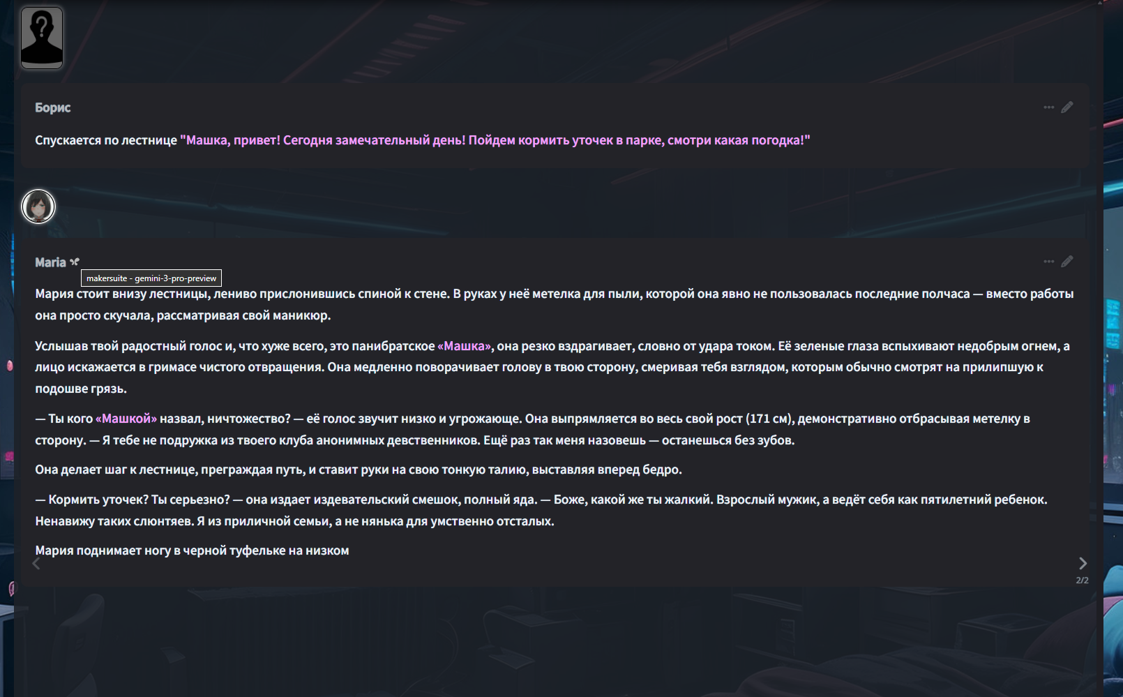 >>1419069 Вот в таком сетинге да, проза триллера со сравнениями и ужасом сюда подходят. Но не тогда когдая я блять играю повседневность, пью чай с тянкой. Вот у клода есть 2 патерна на персонажей, но дохуя на наратора, а у гемини 1 патерн на нарратора, который фиксится полностью только урезанием ответов до чайных размеров+огромная сухость