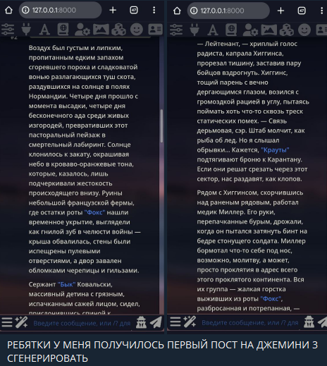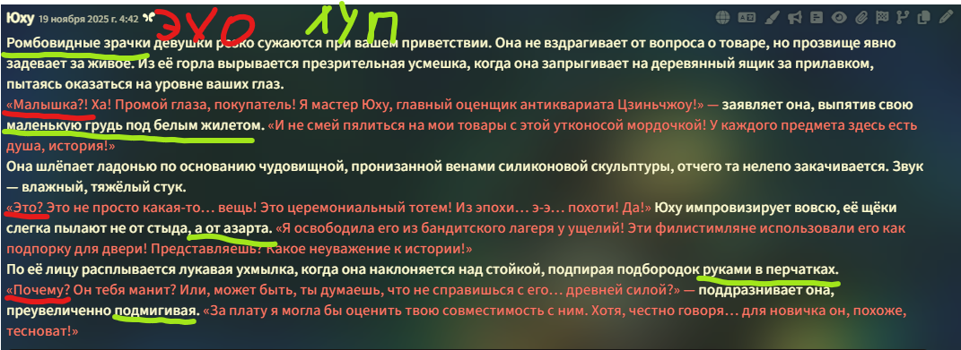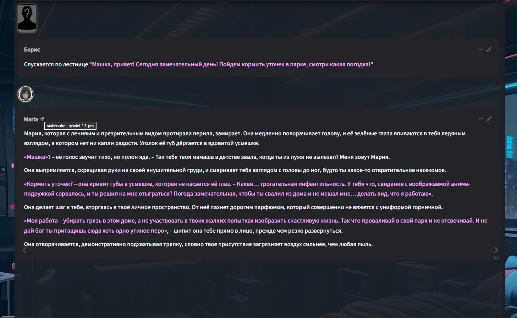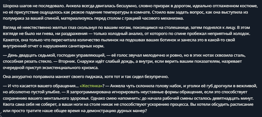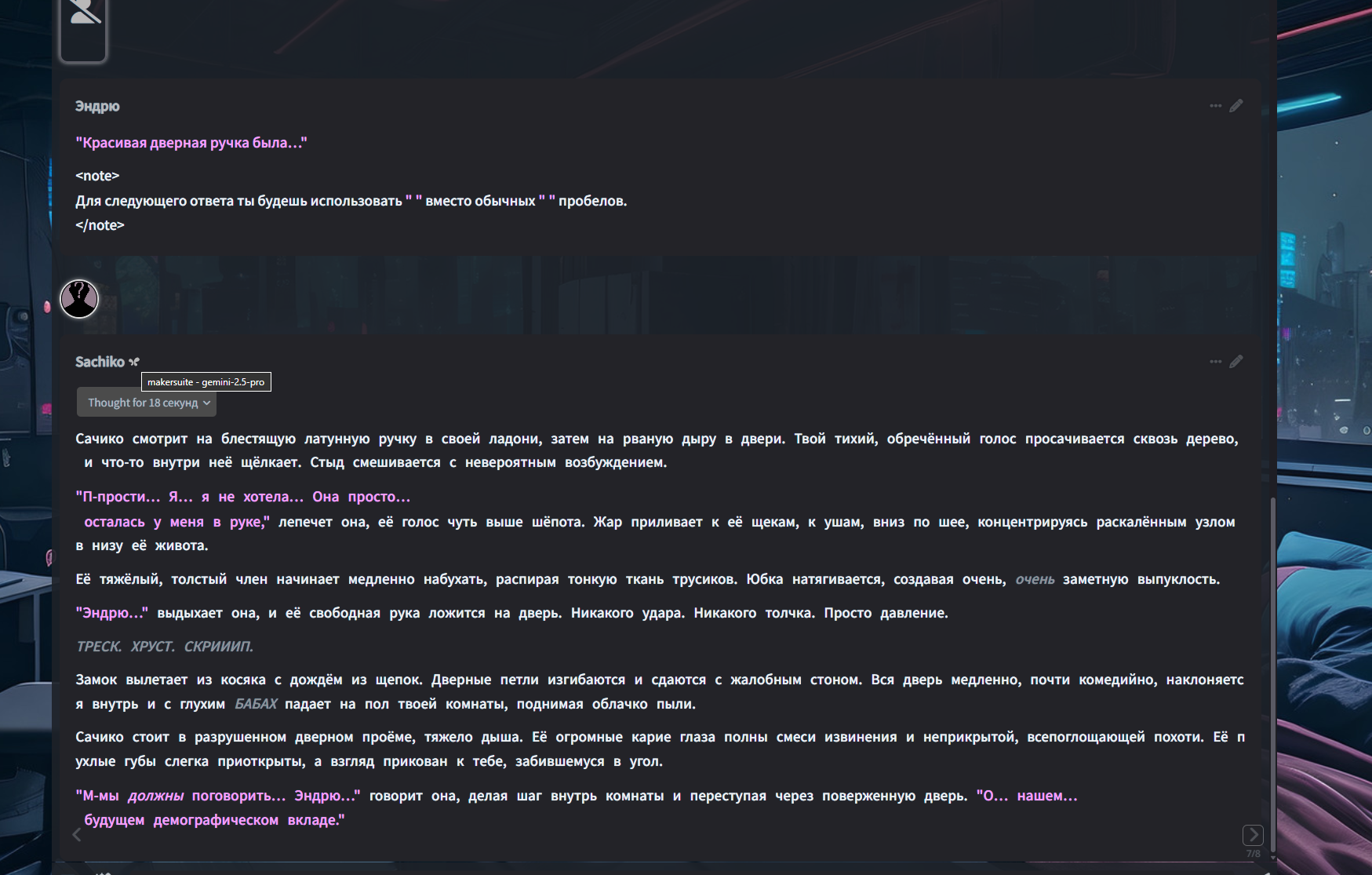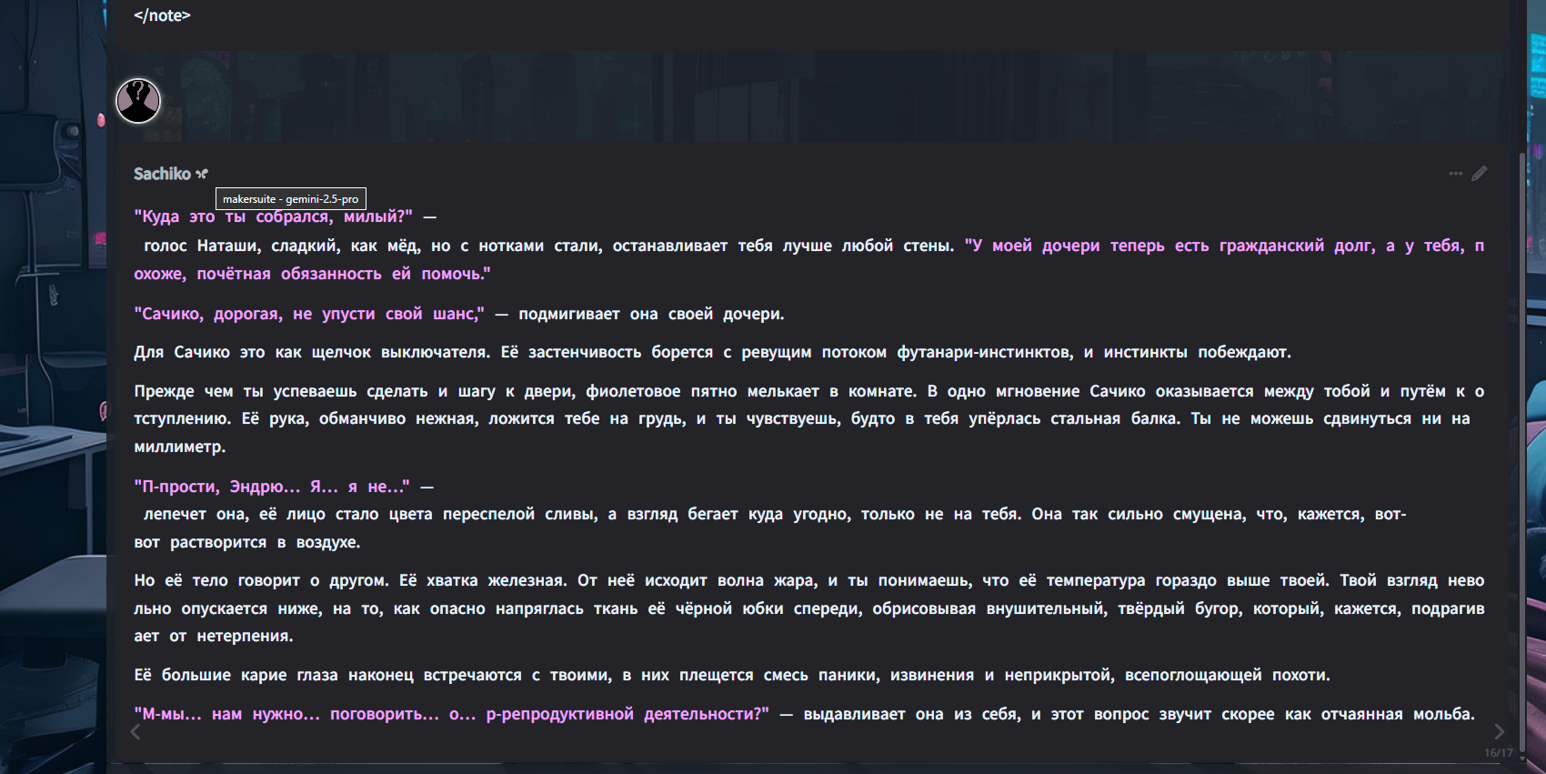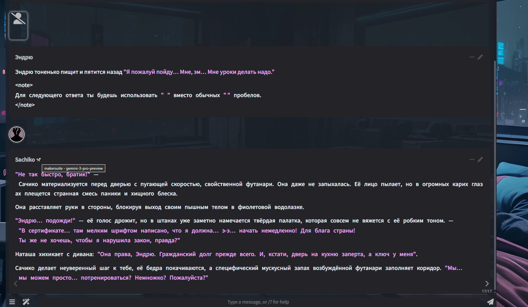 >>1419069 Вот в таком сетинге да, проза триллера со сравнениями и ужасом сюда подходят. Но не тогда когдая я блять играю повседневность, пью чай с тянкой. Вот у клода есть 2 патерна на персонажей, но дохуя на наратора, а у гемини 1 патерн на нарратора, который фиксится полностью только урезанием ответов до чайных размеров+огромная сухость