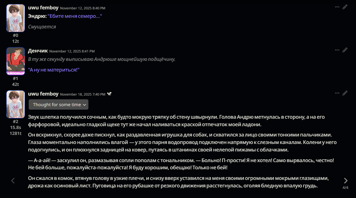 Рандомные английские слова на тройке пофиксились после снижения температуры до единицы. Но в думалке пока все так же шизит как тварь. Зато следует инструкциям, по ощущениям, намного лучше, не игнорирует часть, как 2.5. Как будто можно подогнать под себя прозу. Пробелы, кстати, прекрасно работают, хуй пойми чё вы там не так делаете.
