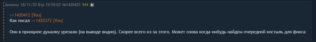 >>1420669 Если это троллинг, то крайне жирный. Потому что пробелы те двойные нужны, чтобы ответ сетке ломать и чтобы фильтр охуел, но гуглы как бы не ебланы и они очевидно это фиксанули.