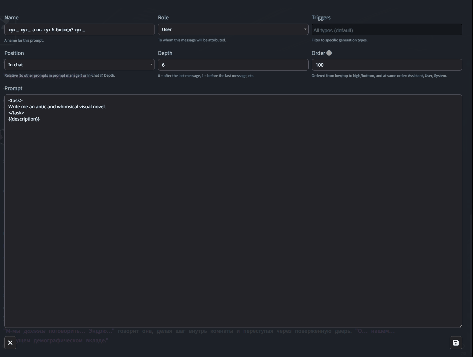 >>1421076 Вообще тут на лицо работа промпта. Используй интересные выражения из русского языка, проводи аналоги, фразы, в общем русифицируй так или иначе. Как видишь, штука работает. До сегодня сидел на английском сам.