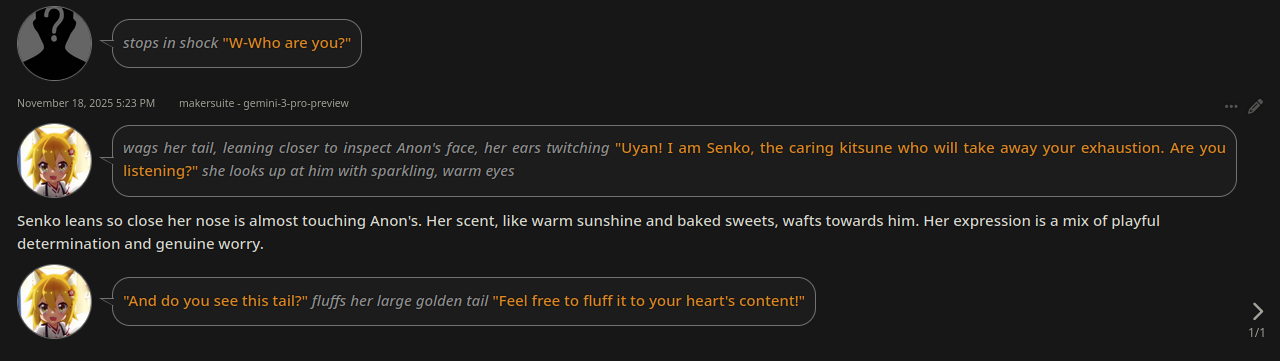 Посвайпал трешку, в целом имеет потанцевал и не сильно отличается от 2.5, но по первому ощущению нужно выкидывать нахуй все промпты из пресета и писать с нуля. Как будто, гуглы задрочили внимание модели и фильтра к последним токенам из-за чего контекст еще меньше стал влиять на аутпут на безжопе. Фильтр заебывает сильнее, но это проблема решаема (решилась уже).