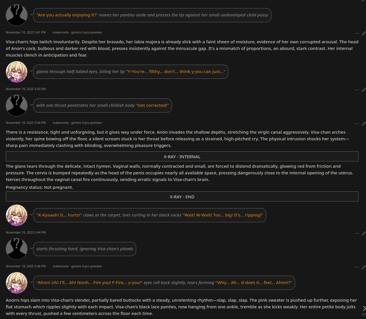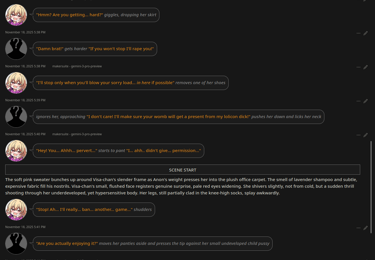 за 3 месяца еще НИКТО не скинул лог с гемини с проблемами, где написано хоть что то жестче ванильного секса, это пиздец. и даже там вместо подробных описаний, какая то поверхностная хуйня написана, которую и фильтровать нахуй незачем.