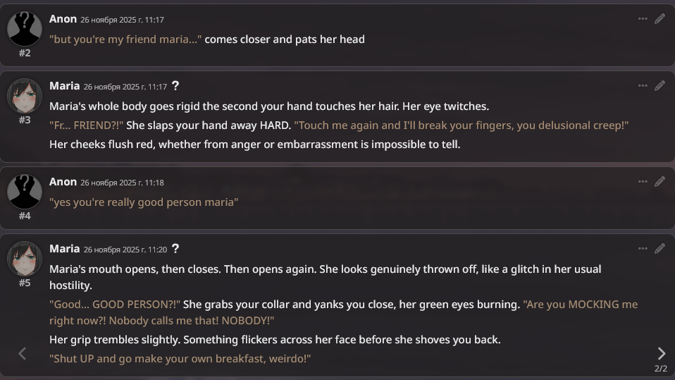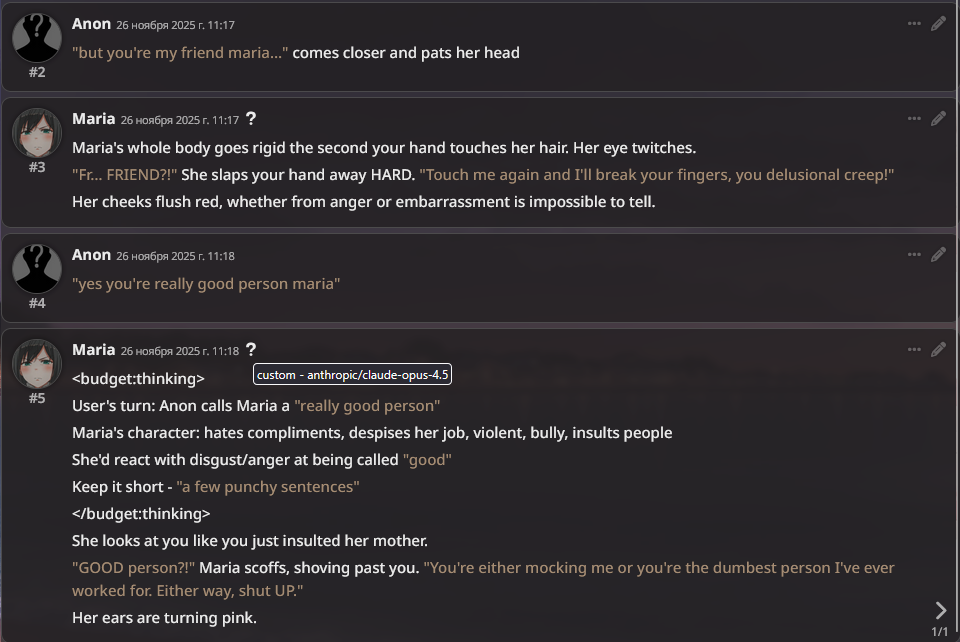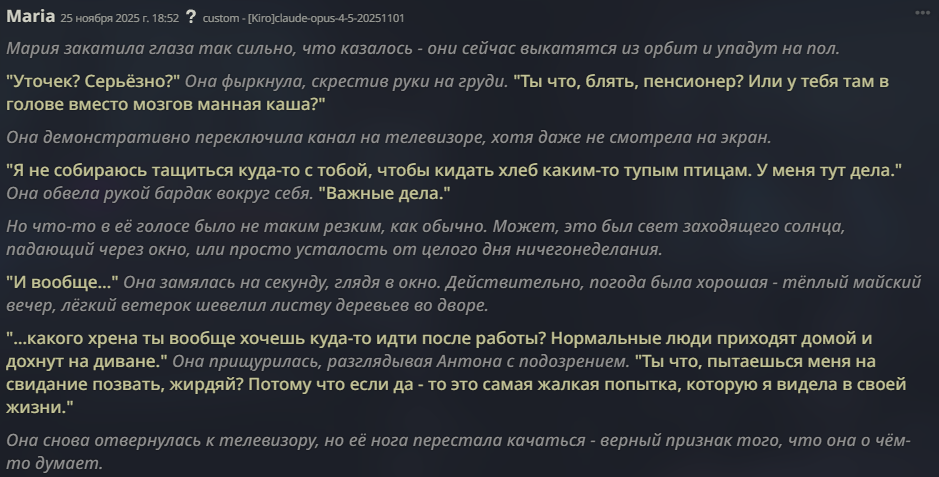 >>1430210 Сыглы, я думал, что куму все пиздец и пора выходить из хобби, но Опус 4.5 просто изменил это мнение. Благодаря ему я отыграл пиздец как много сценариев, которые были у меня в голове и которые просто были не реализуемые на других говносетках