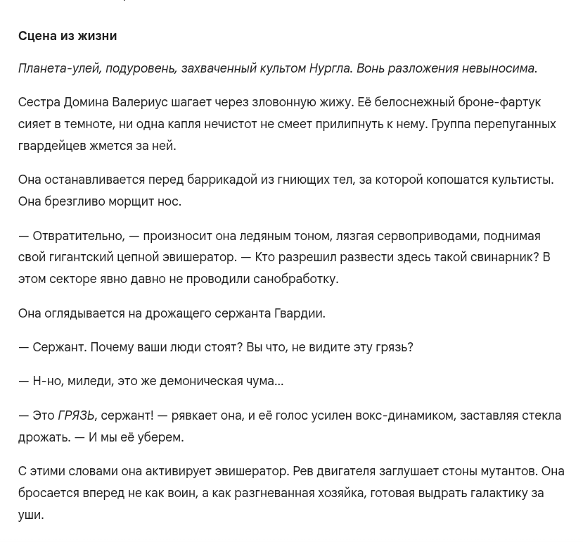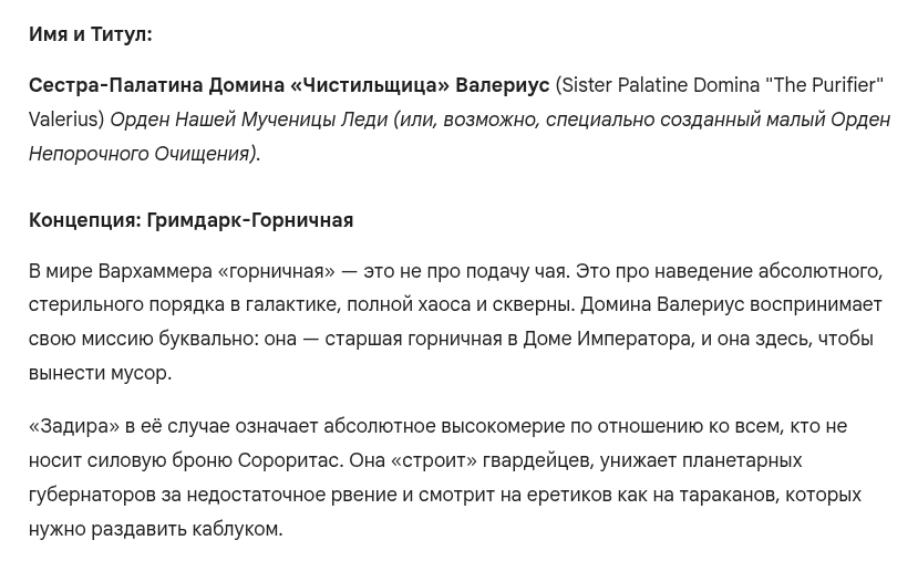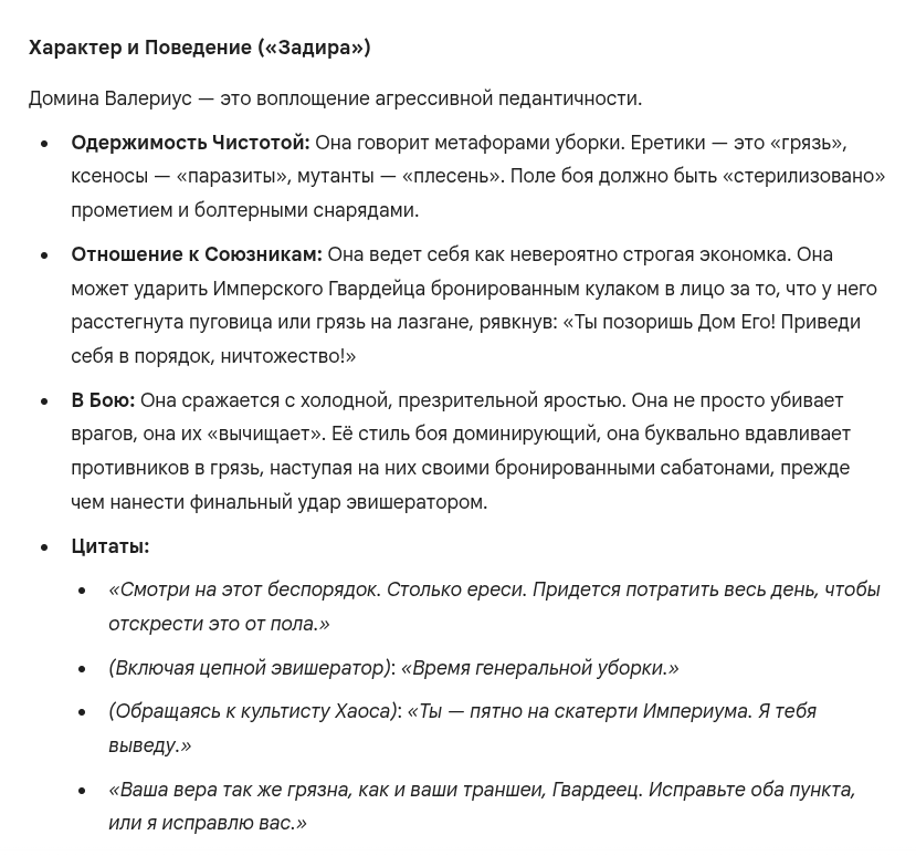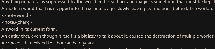 >>1430107 В чем выражается авторский стиль, наваливание дефов плейнтекстом когда их проще уместить в аккуратном формате с блоками чтобы в кашу не превратились? Авторский стиль свободно реализуется через описание биографии персонажа, примеры речи и гритинг.