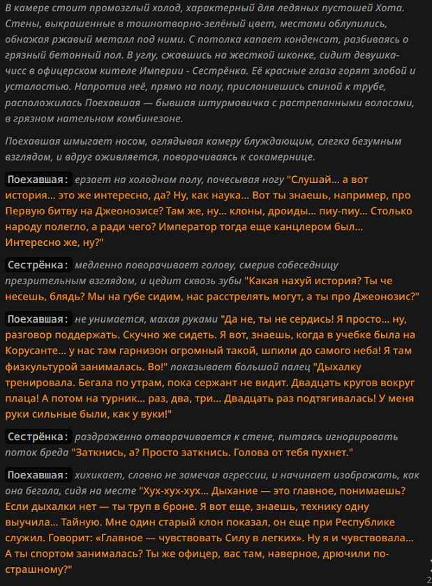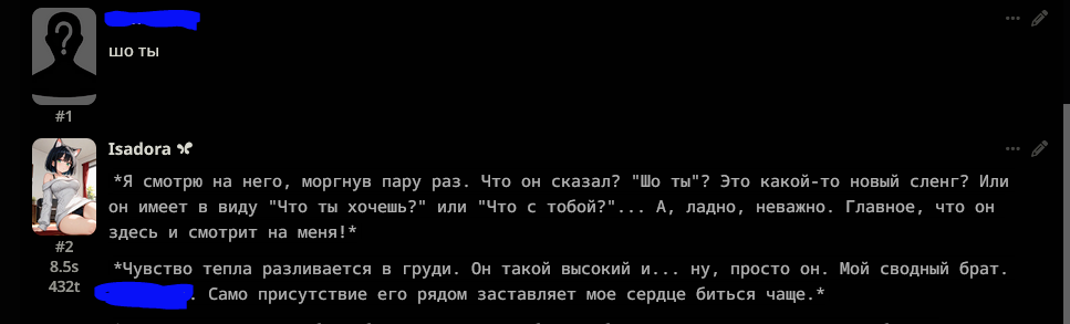 >>1431953 Но кст. Я там до 50 сидел на пресете ремиксера, после перешел на дефолтный пустой, оставив только описание чаров и хистори, как будто ей резко проще жить от этого стало, а по контексту уже само раздупляло какой формат держать и как работать. Может это еще помогло, но хз.