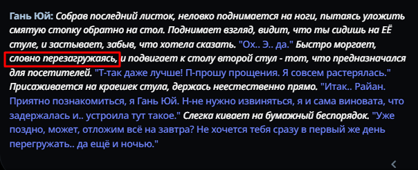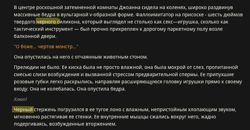 >>1429867 Ха-ха, и правда, откуда? Нравятся такие перлы от нейронок, этакий мета-комментарий, подмигивание от автора читателю. Сразу чувствуется живость текста.