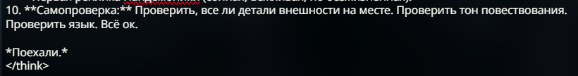 26 Нояб. 2025: Решил на корню проблему... с... точками..., но стало писать хуже + эхо. Имхо, причина эха в наличии результата думалки, из-за этого если убивать думалку то эхо исчезает. А если загазлайтить модель в жесткую что у нее была думалка, то каким-то образом начинается эхо.