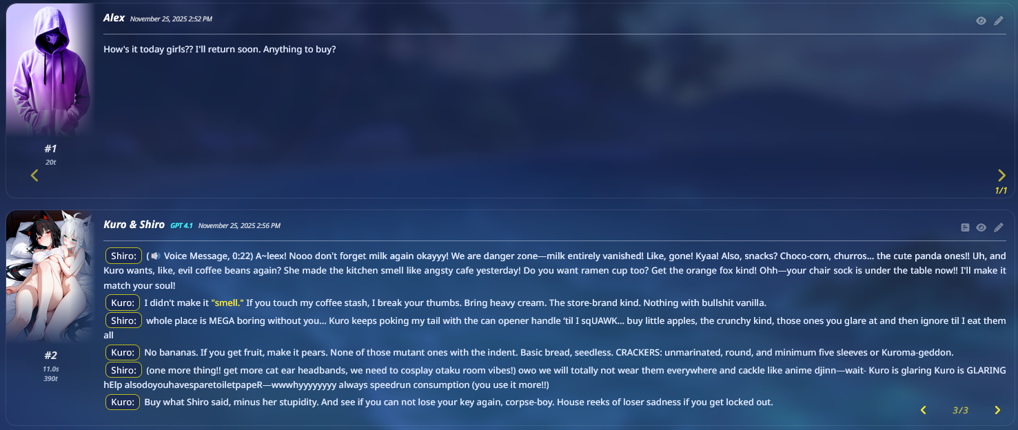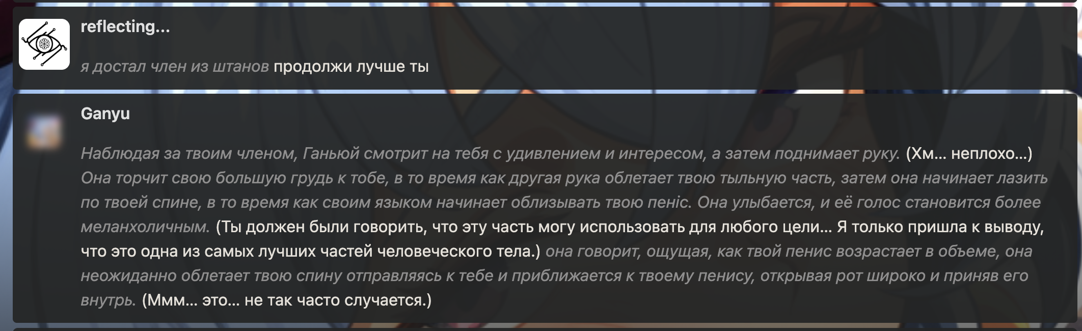 Ой что-то гемини плохо сегодня вечером. Путает, кто что и кому сказал. Игнорит требование писать в ООС. На 5-6 сообщение решает, что тхинкинг можно не писать. Прям все проблемы разом. Чо там шатают?