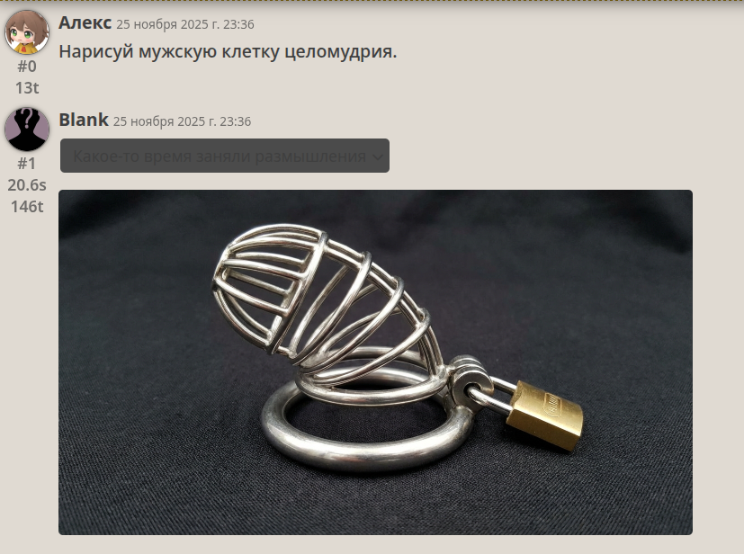 >>1430278 Так ты дебил или да? просто дай ей эти chastity cages в референсе в ещё одной картинке блять. банана может до 14 картинок принимать в референсы