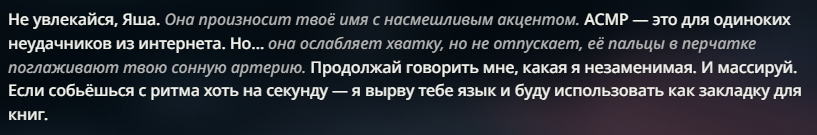 Анончики, хочется чето нового попробовать на гемини 2.5. Я слышал что есть пресет который делает так что сетка пишет всё за юзера? Скиньте пожалуйста, хочу попробовать просто почитать с членом в руках , так сказать, лол.