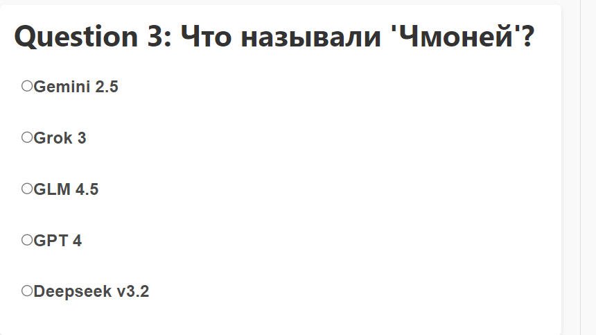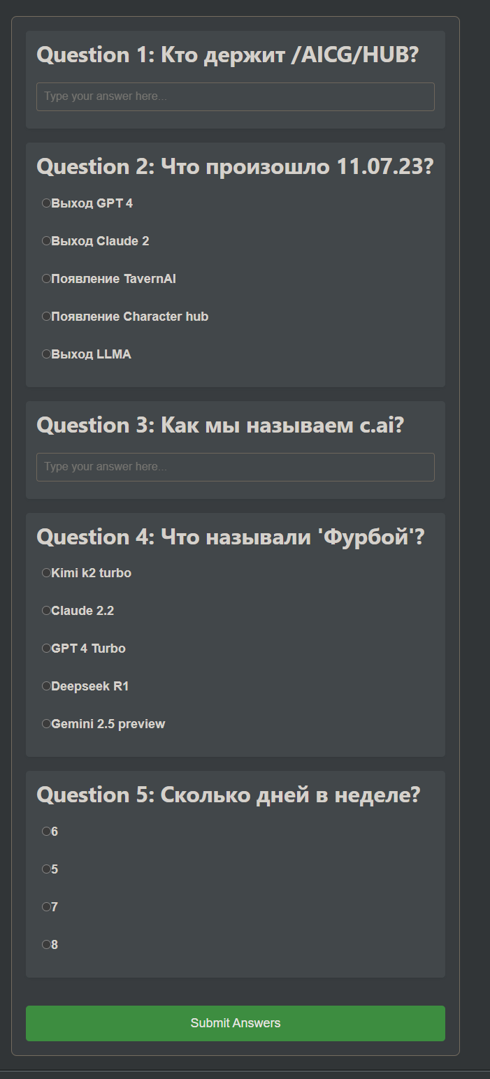 >>1432025 По тому надо точно больше вопросов. Что бы 1-2 вопроса чего-то локального а остальные чисто такие с которыми даже саранча и яойщица справится. Типа что мол даже если просочатся то это достойная сиса а не онли выжирунья токенов жируха..