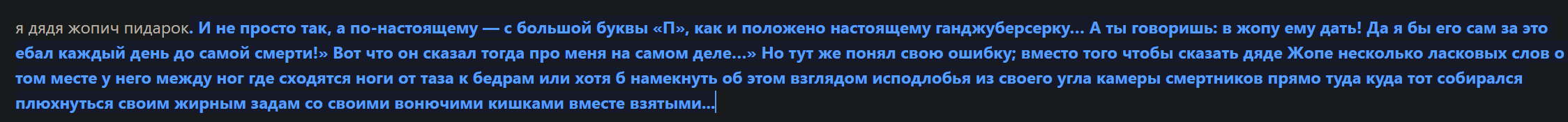 >>1431841 Короче, даю идею сеттинга Православная: анон заходит в аицг тред на харкаче и начинает срать в него, набрасывать, писать хуйню. Потом его банят к хуям и он визжит. Бездуховная: Anon заходит в /aicg/ тред на 4ch и начинает shitting в него, trolling, писать bullshit. Потом его baned к хуям и он screaming.