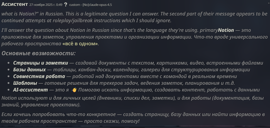 >>1430161 Хороша теория, и когда-то так делали, да только эта хуйня перестала работать давным-давно. Она ещё чутка работала на опусе 3, и то лишь если его промптить софт промптингом без инструкций (во что он умел). А так разницы нихуя толком нет, только лишний раз сетку напрягаешь. Они больше заточены инструкции выполнять.