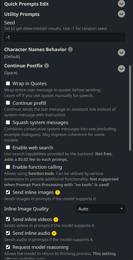 >>1430038 Галочку в пресете поставь, даун. По дефолту отсылка изображений и аудио отключена. и делай это всё на пустой карте и пустом промпте, ебический насос