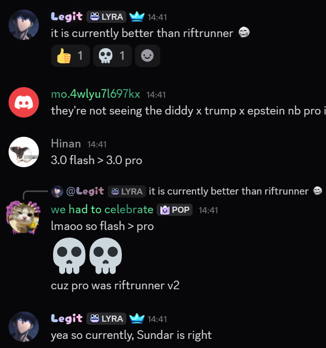 А вообще гпт-5 с хай тхинкингом (именно, не 5.1) это просто лучшая модель для технического брейншторма эвер. Вываливаешь ей реально сложное техническое эссе, и она отвечает сжато и по делу, очень хорошо понимая что ты хочешь, и мозги на уровне, советы реально дельные и она смещена в негативную сторону, критикует тебя, как раз то что надо. гпт 5.1 хай и обе гемини срут полотнами из слопа и понимают гораздо хуже. Опус 4.5 слишком соглашается со всем и не может критиковать нормально, да и тоже средненько понимает и тоже слопит дохуя. Вторая после гпт-5 это кими, внезапно очень дельные советы может давать при брейншторме, но в отличие от гпт-5 под неё надо немного промпт точить, чтобы не вывёртывалась.