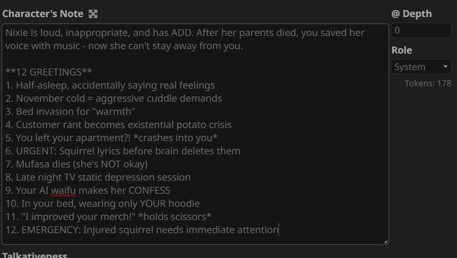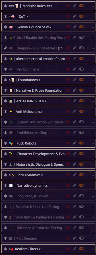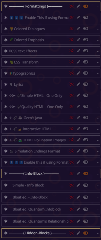 блять всё, я не могу дальше, там дохуя текста пиздец. там короч дальше дохуища блять разных рычажков, то есть буквально что захочет видеть юзер в данный момент в рп - тот рычажок и включает. в чем смысл? чтобы просто играть в блокнот ебаный? все эти рычажки просто мусор по умолчанию, который надо удалять с любого пресета. если честно, никогда не анализировал чужие пресеты, просто интересно стало кто че пишет, понимаю что пресет для сырков так что похуй.