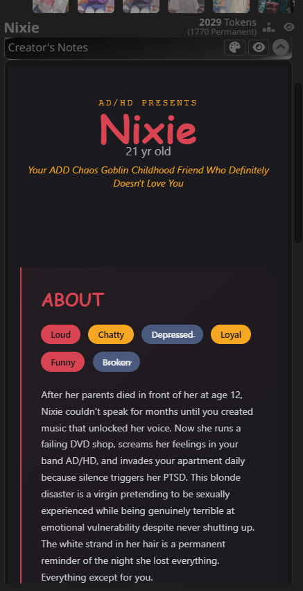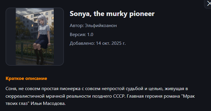 >>1432054 (OP) Никси - твоя веселая безбашенная подруга детства со скрытой травмой и аллергией на холод. Вокалистка в твоей нойз-поп группе а так же няшка-ебанашка которая течет по тебе пока у нее течет крыша. Когда она потеряла своих родителей ты был рядом и вытащил ее из депресняка. Годы спустя вы все еще вместе и все еще не признались друг другу в истинных чувствах. Этот ноябрь обещает быть особенно тоскливым, анлесс...