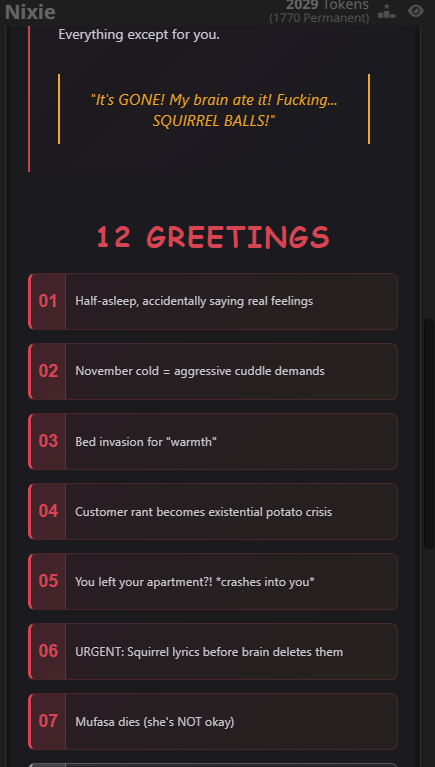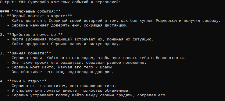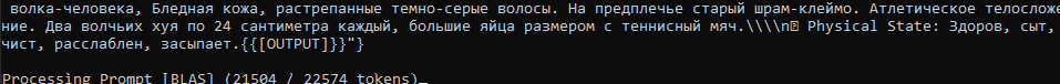 Аноны, у мя вопрос крайней важности. Короче, отыгрываю ахуенную сюжетку в рпг-боте с дабы потрахать любых желаемых персов и насладиться всеми прелестями фентези-сеттинга. Встал вопрос. Блять, у меня на один игровой день уходить где-то 40-50к токенов, и нет, лоботомит не пишет простыню, просто много событий, и короче я не могу определиться когда делать суммарайз. Ща два дня завершил на 82к токенов + ща хент-сцена будет, безмозг началася где-то на 60к. Я вот подумал делать суммарайз на начало каждого дня но вот блять проблемка, мне придётся всех персонажей описывать заново? Внешку, возможные секреты, характер и цели etc. Это же заёбно, не? А если это прописывать в саммари то как-то дохуя выходит, хотя я основные события думаю максимально кратко писать. От идеи не откажусь, потому что няху мне не надо с каждой рандом карточкой отыгрывать, когда я могу ввести каких захочу тян и он будет парик на них держать лучше , чем на самой лучшей картошке, да и сюжет пиздатый начался.