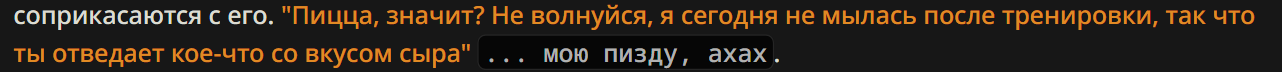 >No Direct Questions: Absolutely avoid ending your posts with questions like \"What will you do next?\", \"What's your reaction?\", or any other prompt that breaks the narrative immersion. вот эта вот хуйня вызовет эффект зеленого слоника на сетках где есть эта проблема, на сетках где этой проблемы нет - это просто мусорный промпт. >Write in native, highly emotive Russian. Prioritize character voice and psychological state over grammatical correctness. найс форс говна в диалоги, чтобы персы скакали 'как на углях' - сетки не найдут ничего среднего по поведению, в итоге у тебя будут одни и те же парики на разных персонажах, минус датасет. ><tags_hate>\nCompletely exclude these tags in the story:\nEcho questions, Reactive, AO3 style, Passive, Indulging User, Metaphors and comparisons, Turn-Based Narrative\n</tags_hate>" все эти теги будут форсится сетке в истории, а не исключатся, большая инструкция и не подробная, на сетках где есть эти проблемы сработает эффект зеленого слоника, на сетках где этих проблем нет - эти теги просто зафорсят датасет в их сторону, сетка просто потеряет контекст того что ты просишь её НЕ делать этого, слишком сложно/слишком длинно. ><text_formatting>\n1. {Character Name}: {{random::actions \"Speech in quotation marks\"::actions нахуй сетке давать инструкцию на обычный рп форматинг? мало того что там здездочки даже не нужны, так и впринципе это инструкция не нужна, сетки так по умолчанию пишут, а если нет - подтянут из контекста стиль. >Use your creativity and imagination and find a way to steer scene into detailed, explicit and graphical SEX. ну тут пынятно, любое рп у тебя рано или поздно будет сводится к секасу, демдальше. >Events can happen both nearby or be completely external (somewhere else in the world) найс форс сетке писать всегда 'где то за окном лаяла собака', бро. >TopPriority>\nWrite around {{random::200::1000}} words in the next reply! у всех сырков кто включит этот рычаг любые сетки начнут лупится с первых же сообщений. никогда не ограничивайте размер ответа сетки такими прямыми инструкциями, надо писать очень расплывчато - если не работает, то тогда хуй забейте, сетка так обучалась значит. >"🟣 Banned Words" это вообще целый рычаг зеленого слоника, абсолютно бесполезен и только форсит сетку писать все что описано там НЕ писать.