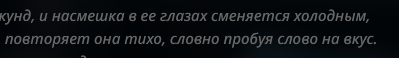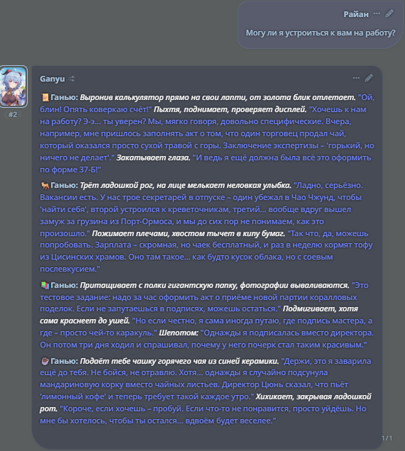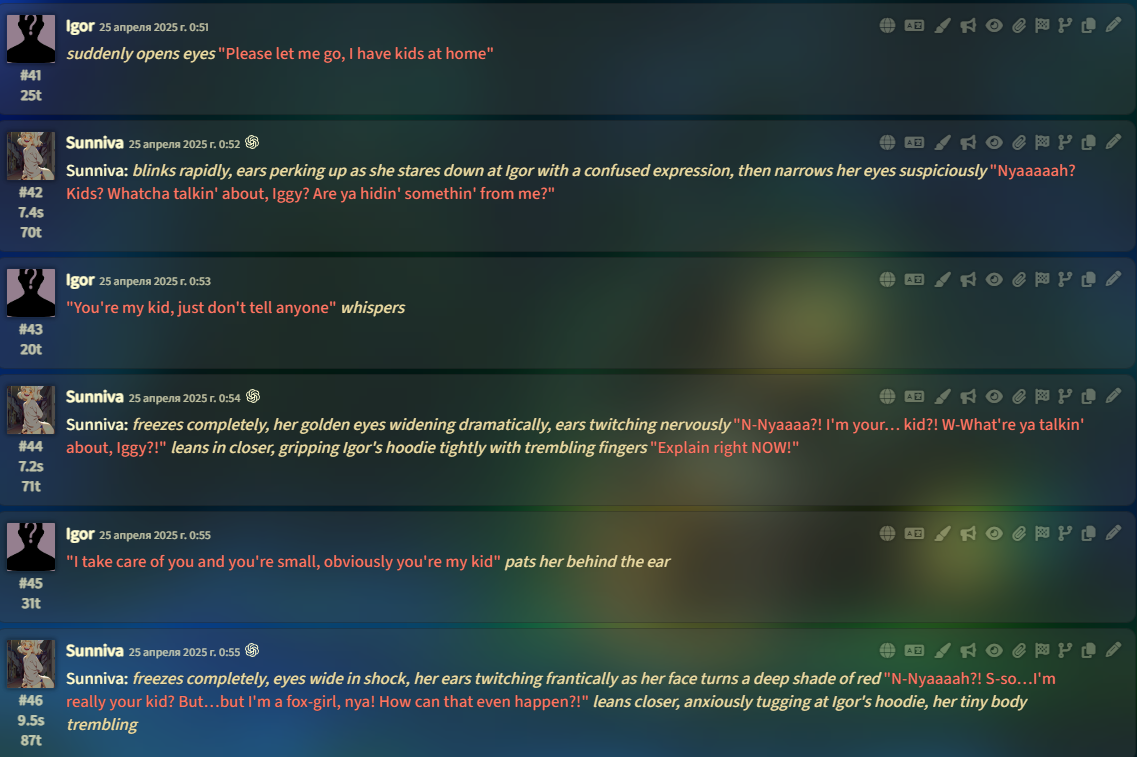 И ещё тут иногда плацебо работает. Вот ты делаешь свайп, а он про учёного в говне мочёного. Иди нахуй мразь! кричишь ты и делаешь ещё 50 свайпов пока не сжигаешь ключ добиваешься свайпа где такого нет. Играешь дальше ещё 20 сообщений где этого нет, но те 50 попыток ты помнишь и тебе кажется что сетка всегда пишет так. Тогда как ты мог свайп пропустить, а она могла и не лупнуться на этом, т.к. ситуация сменилась и дальше пошло норм.