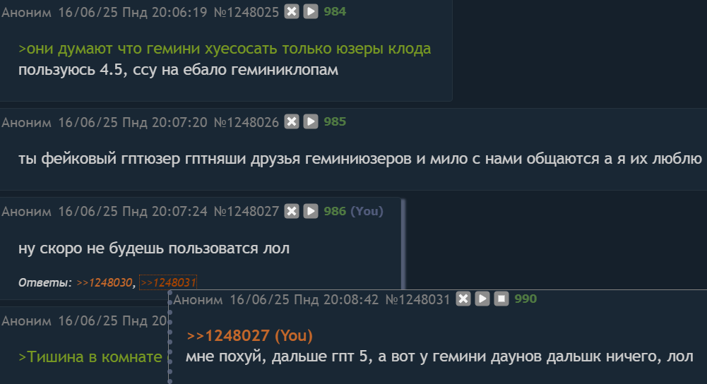 >>1432520 Не совсем понял тебя, анон... Мне гемини действительно не нравится (последнее время даже как ассистент), но я понимаю, что в треде многие на ней сидят, поэтому пробивы нельзя не добавить. А так у меня гопотынька 4.1 самая любимая на все случаи жизни, плюс и доступная максимально.