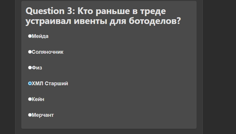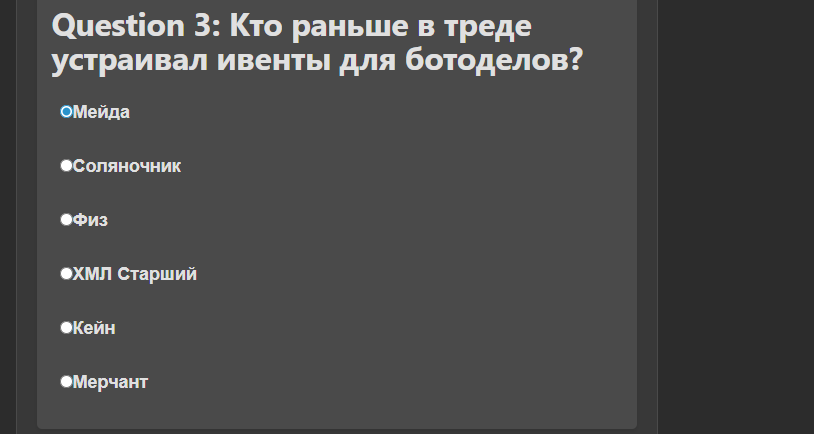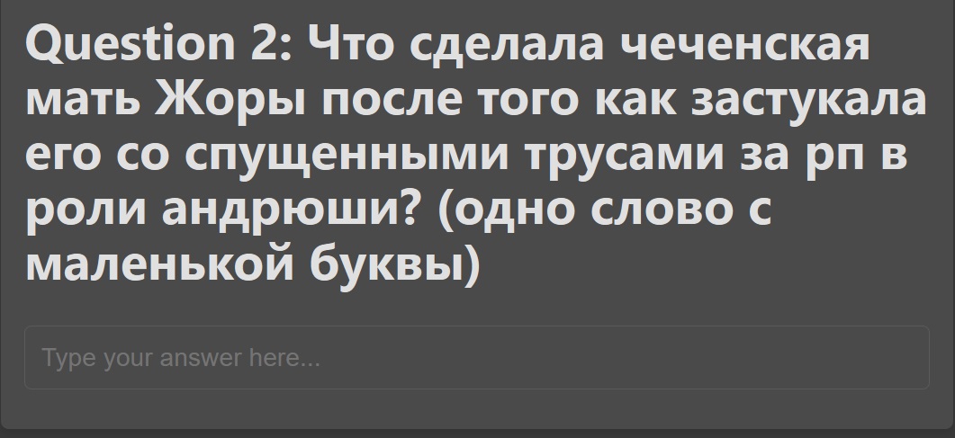 Помидор го поставь санса для теста, посмотрим как быстро народ будет набиваться, вангую это всё ещё более качественный гейткип и надёжный поскольку вон уже пошли ответы сливать, заебёшься их переделывать каждый раз, щас по тгк разнесут полный список и ещё хуже чем неуязвимый пароль будет где реально походу только 3-5 анонов смогли догадаться...