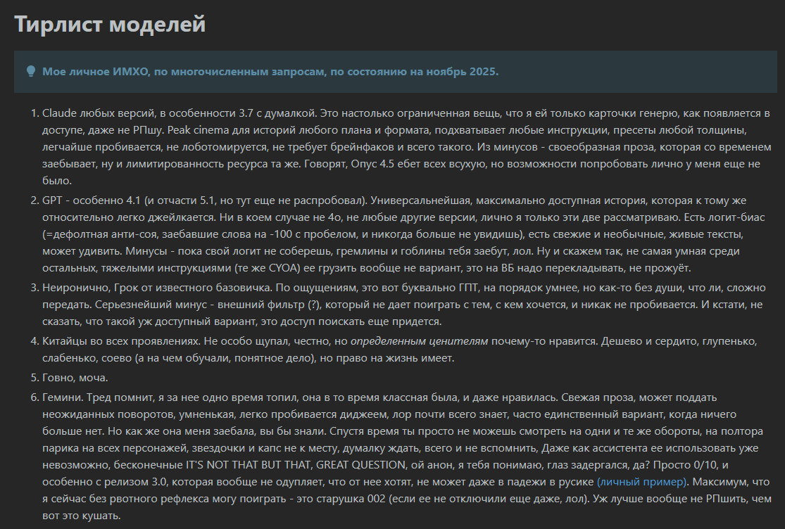 >>1432576 ну реально думал услышать что то вроде опуса 4.0 вот это интересный момент почему бы не добавить такую информацию в свою рентри? да и остальные пресетоделы тоже могли дядя ж. вон написал же тирлист*